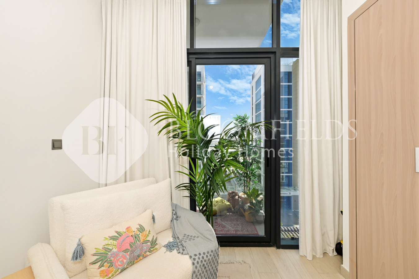 • Soft, sunlit studio with calm, airy interiors