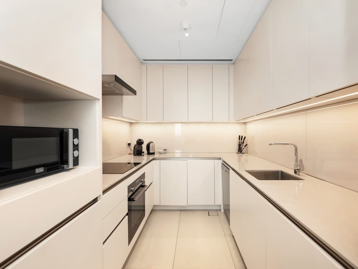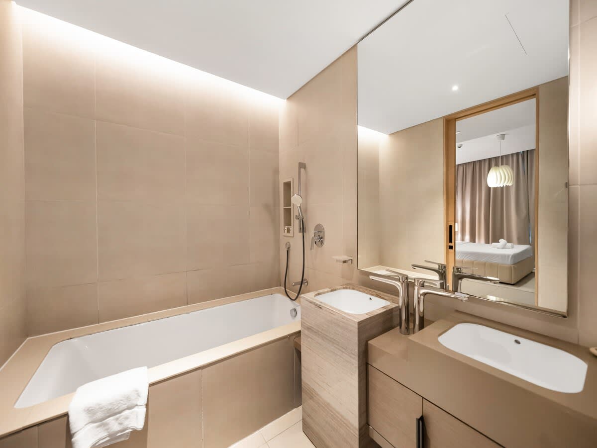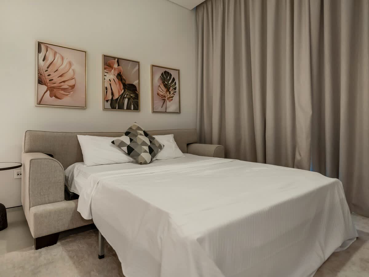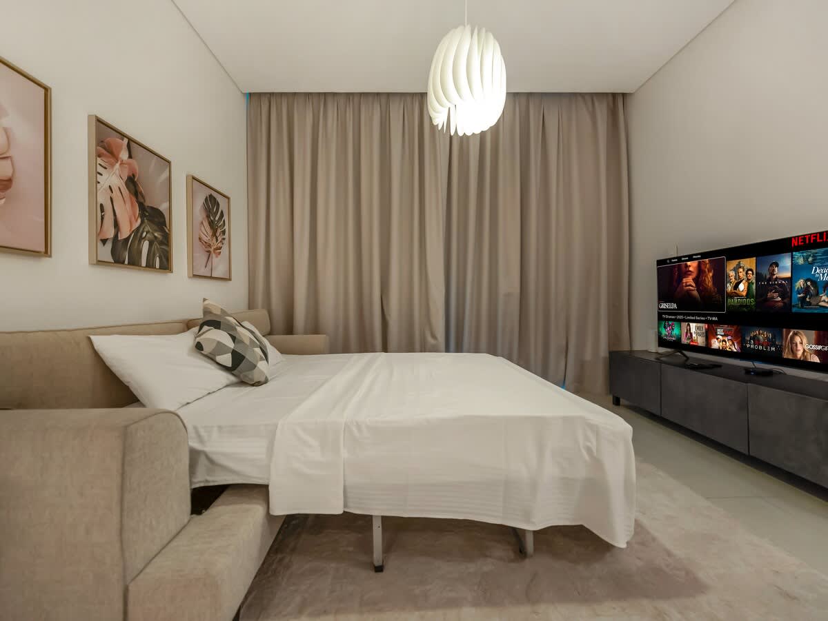 The master bedroom features a plush king-sized bed, dressed in premium linens for a restful night’s sleep. In the living area, you’ll find a spacious double-sized sofa bed, providing extra sleeping space for additional guests. Whether you’re traveling as a couple, with family, or friends, this apartment ensures a relaxing and accommodating stay for everyone.