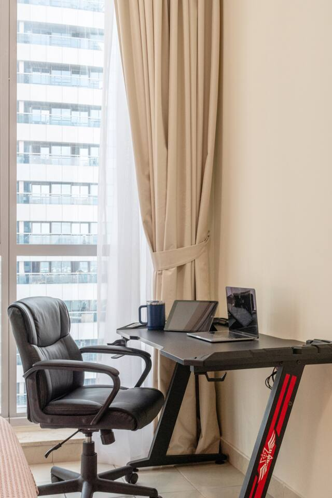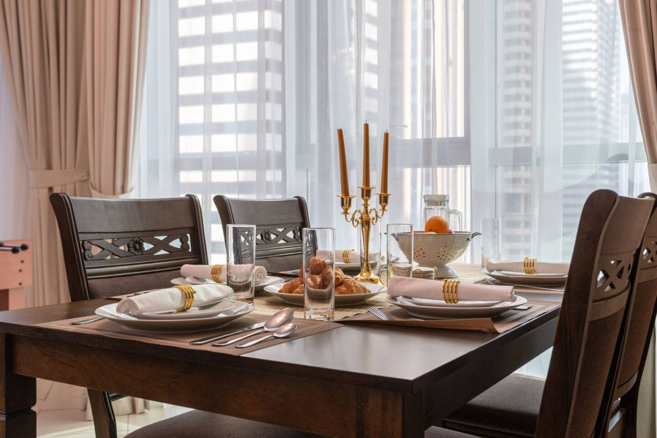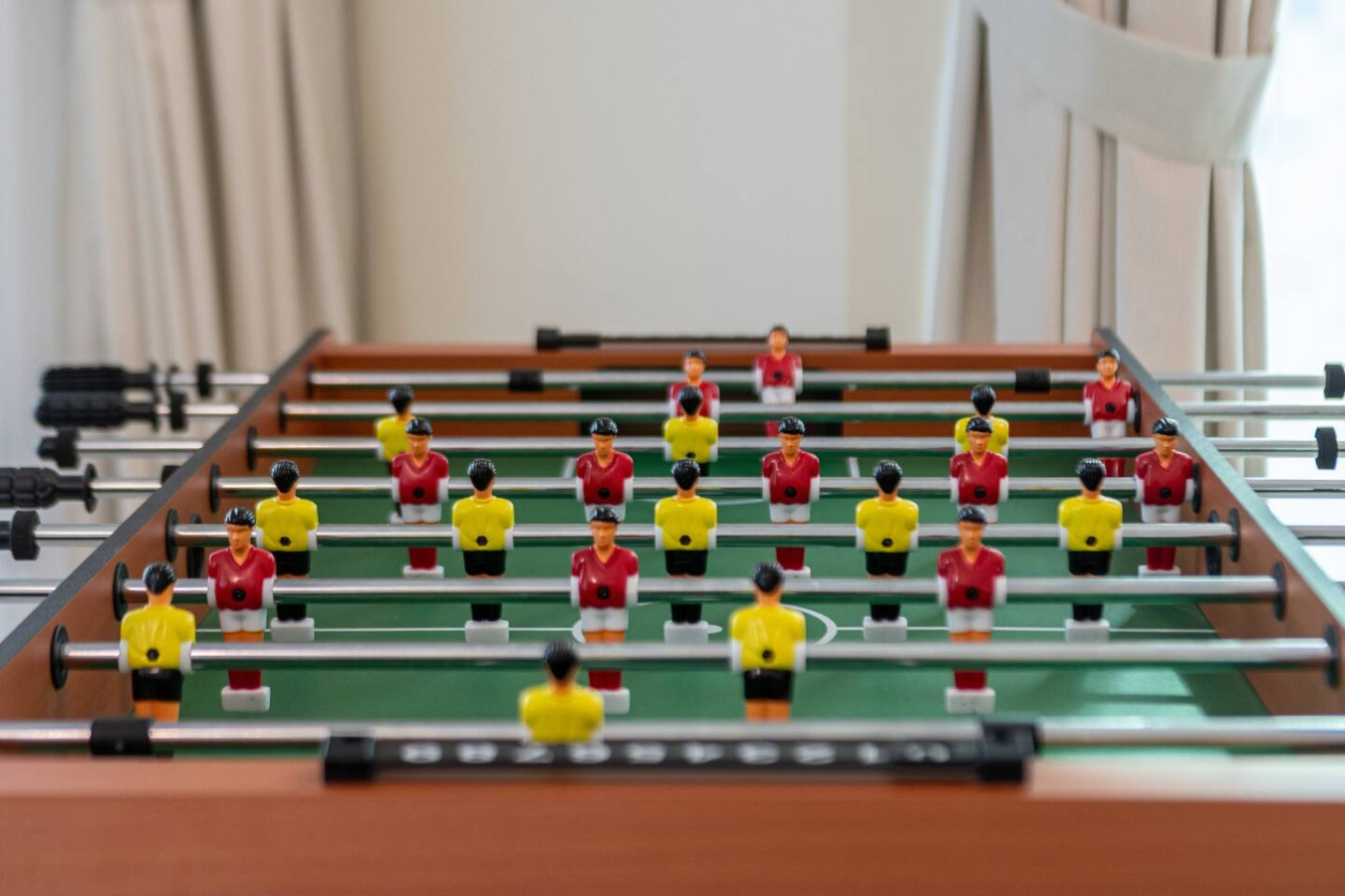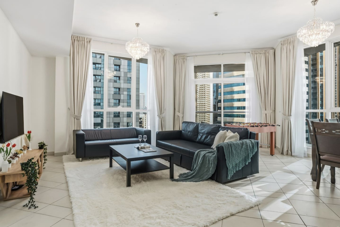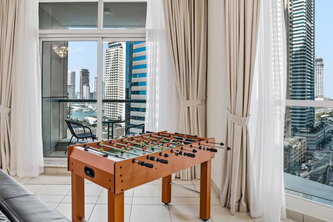 The open living space is bright and inviting, with a dining table for shared meals and a foosball table for easy entertainment. The second bedroom also includes a work desk with an ergonomic chair, perfect for remote work or focused study.