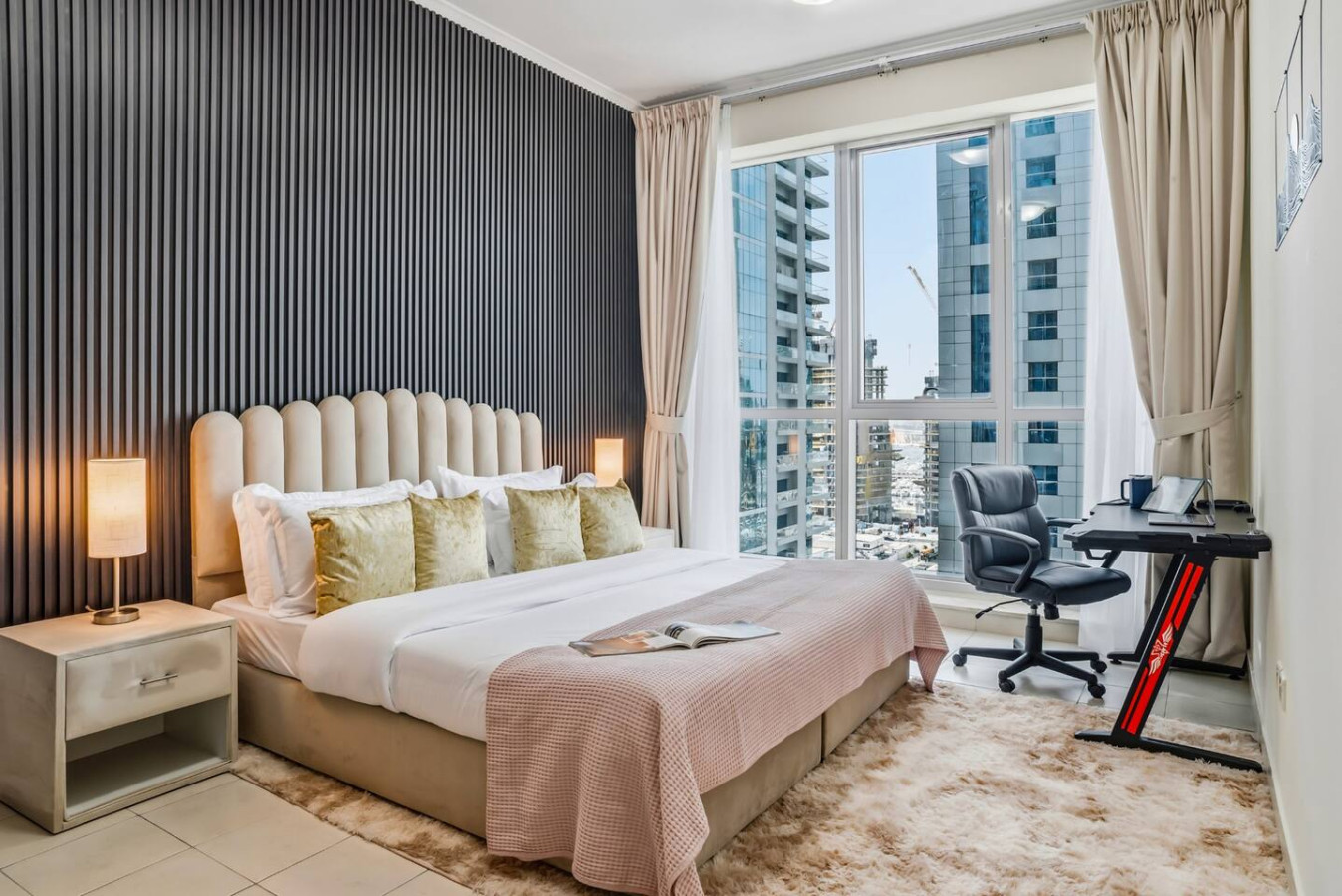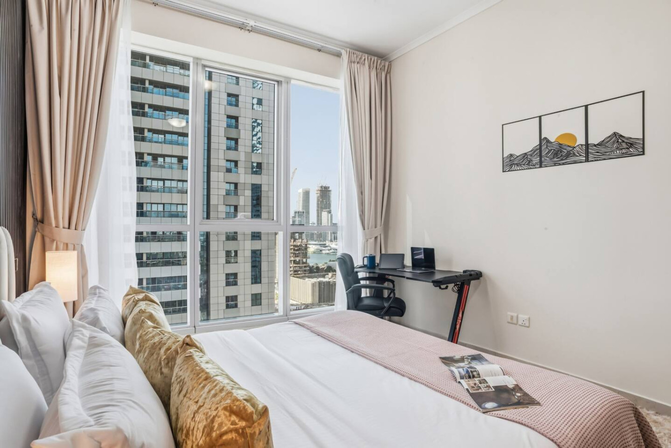 Wake up to Marina views in this bright 2BR apartment in Dubai Marina. Both bedrooms feature king-size beds with hotel-quality linens, and the home sleeps up to 6 guests. Enjoy 2 bathrooms (one with bathtub), a private balcony, smart TV, high-speed Wi-Fi, and a study desk with ergonomic chair. Fully equipped kitchen, gym, pool, sauna & steam. Steps from Marina Walk, supermarkets, and restaurants.