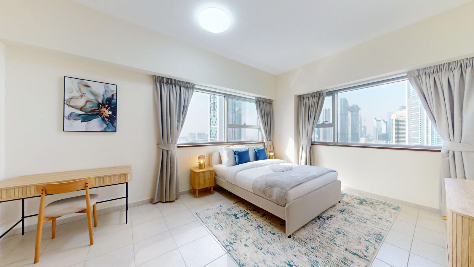 – Large windows with natural light and showcasing the city skyline