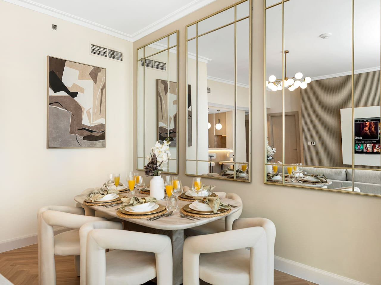 There is a modern 6 person dining table, with 6 upholstered dining chairs, where you can have a meal with your loved ones. a