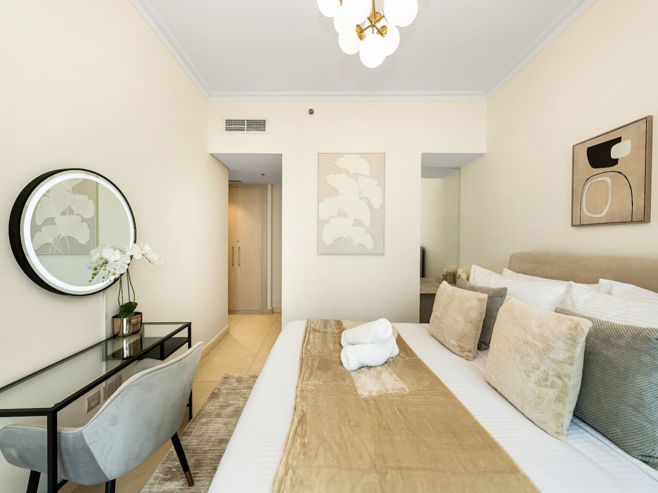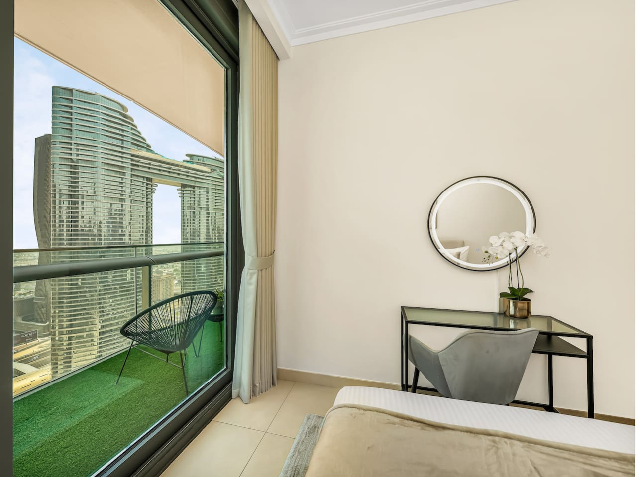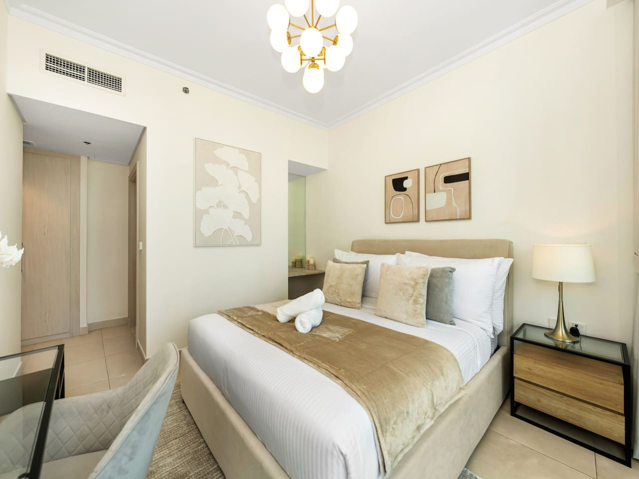 The spacious layout has been carefully designed to allow more natural light, making the apartment radiant and bright, with unobstructed views of the Dubai Skyline. The apartment has moderm, unique décor, soft new rugs & modern wall art.