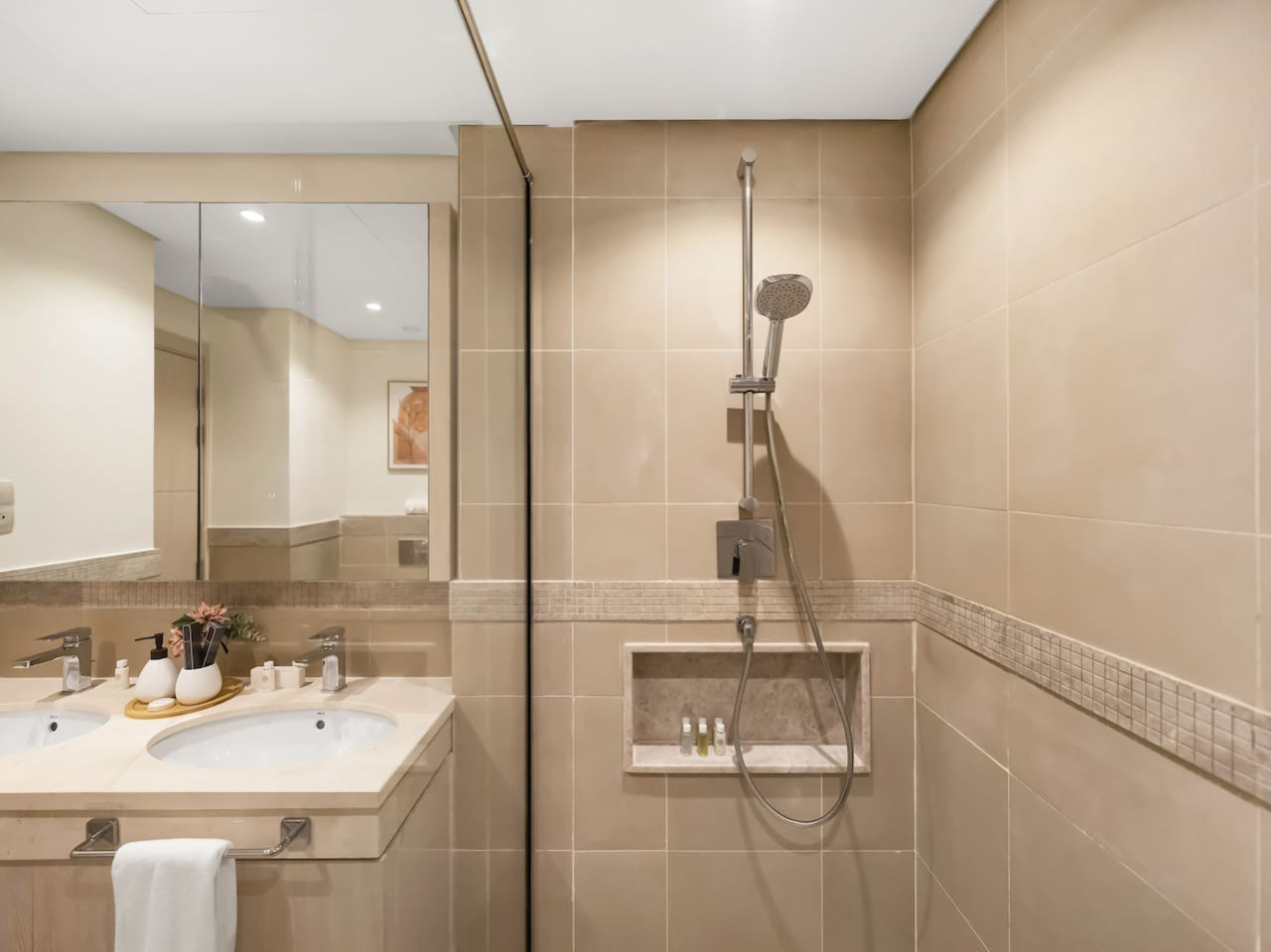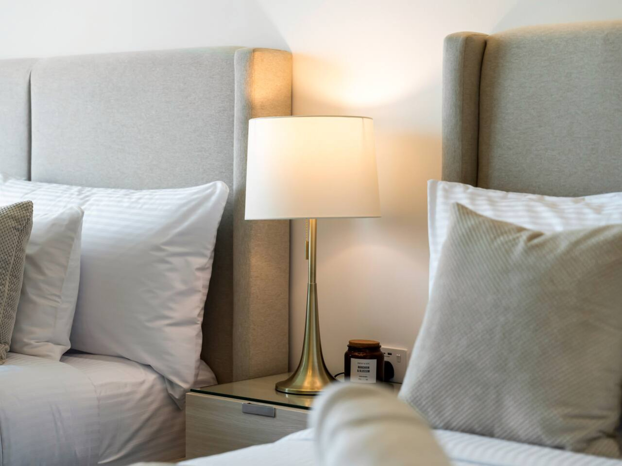 Both bedrooms have ensuite bathrooms with fresh towels, toothbrushes, shaving razors, shampoo, conditioner, shower gel, and body lotion provided for guests.