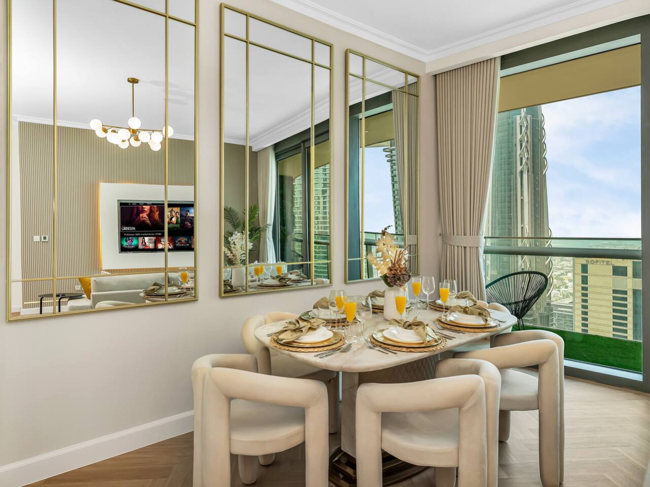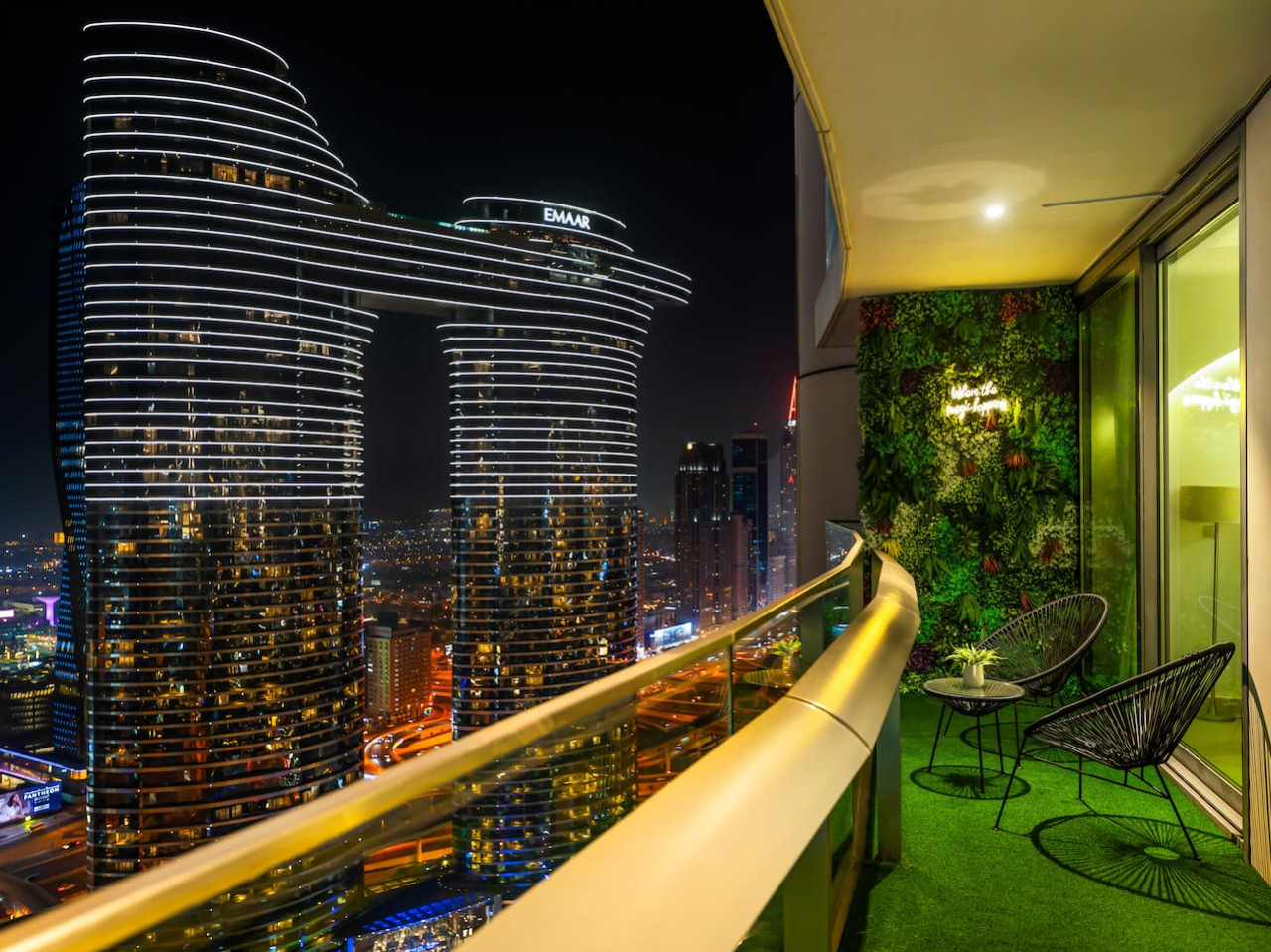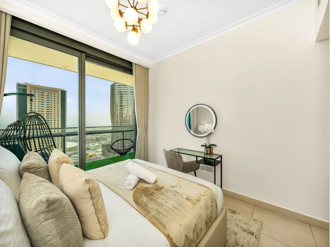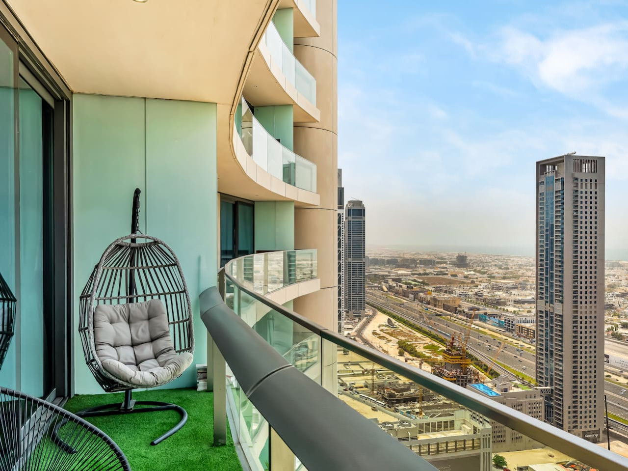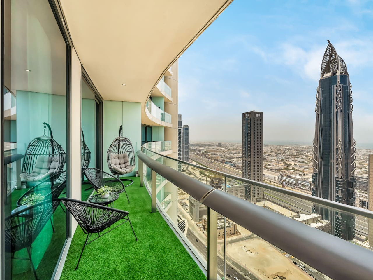 Don’t miss the opportunity to enjoy the private balcony that offers stunning views of the Dubai Skyline! The balcony is furnished with ample outdoor seating, including a swing chair, allowing you to relax with your loved ones while savoring your favorite beverage and taking in the breathtaking views.