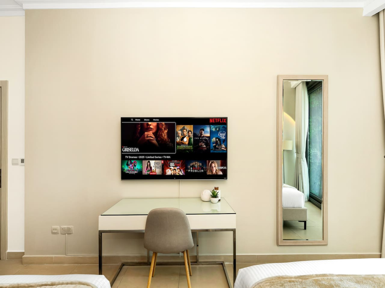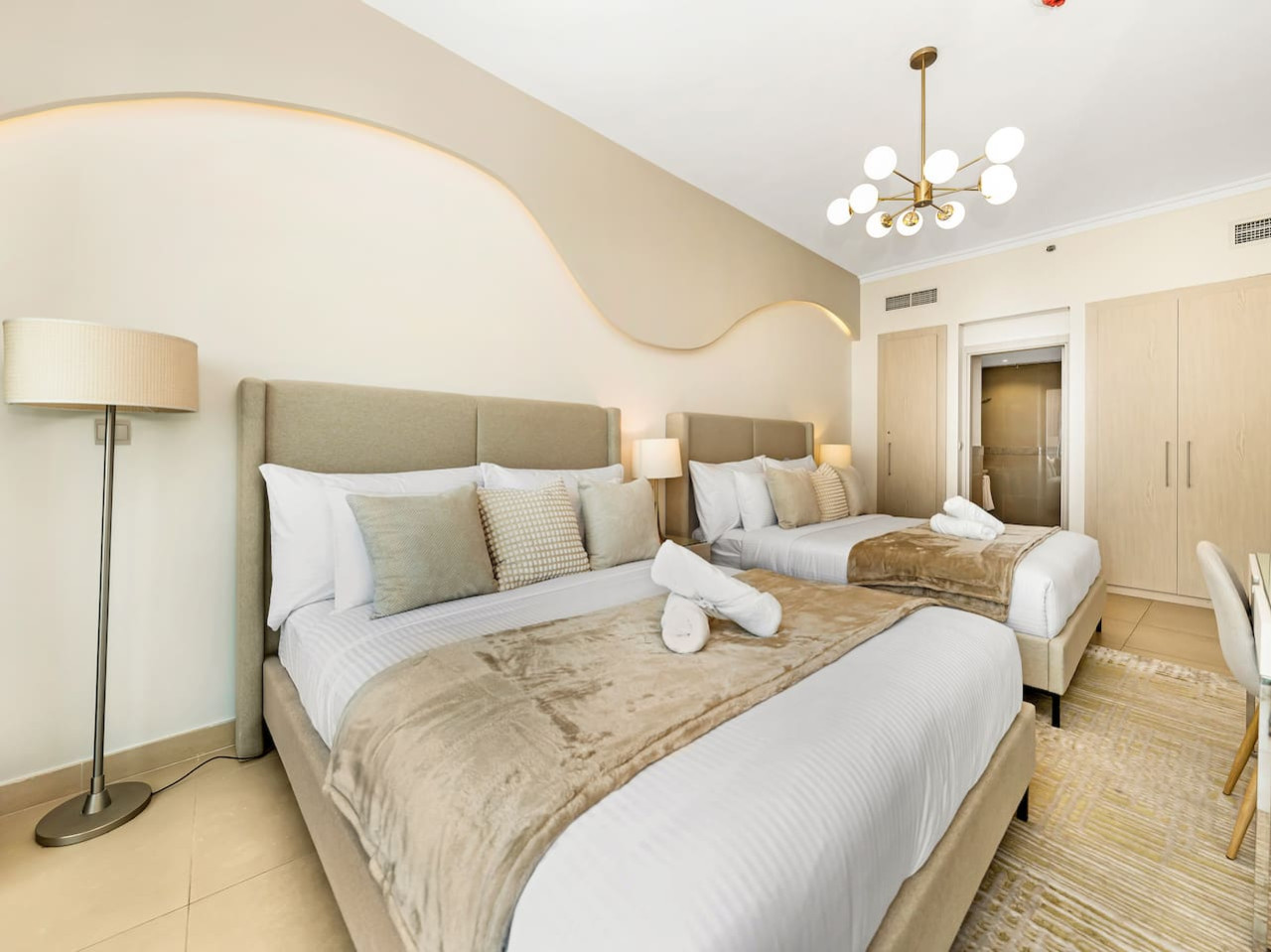 Walk your way to the master bedroom and you will surely love this cozy space furnished with two queen-sized beds, fitted with brand new high-quality orthopaedic mattresses and fresh premium linens and pillows for that sound sleep everyone is dreaming of. This space comes complete with side tables, table lamp, charging sockets, built-in wardrobes, and a vanity or working space.
