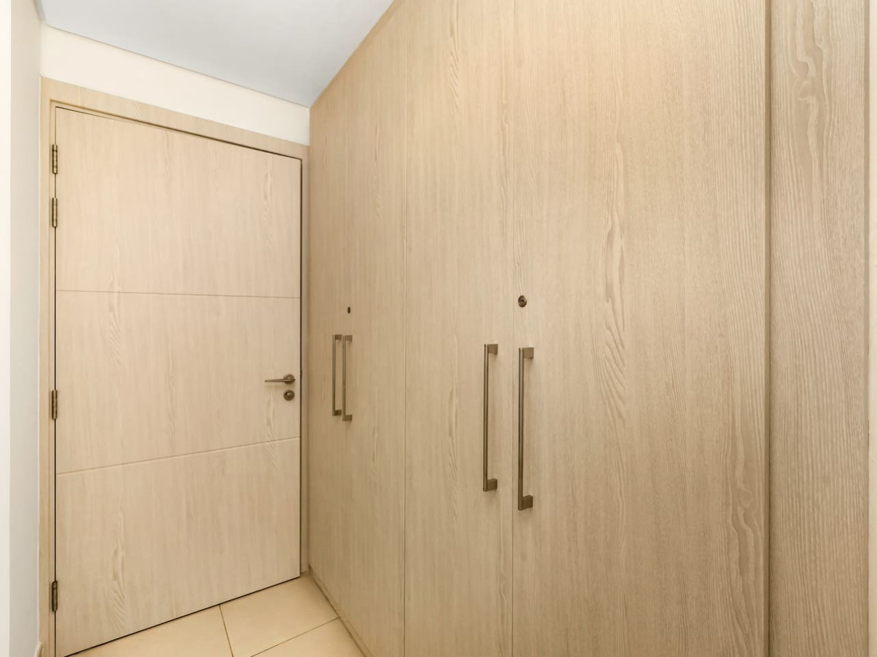 The second bedroom is cosy and also has balcony access, featuring a dedicated workspace unit as well as a separate built in dressing area.