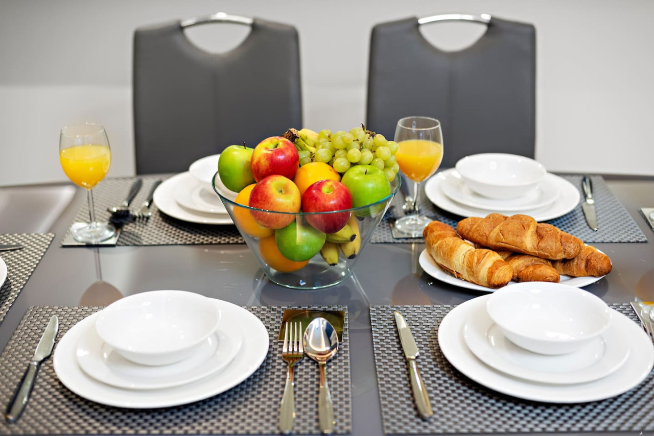It is fully equipped with stainless-steel cooking appliances that make it suitable for preparing any meal, whether a simple breakfast, quick snack or a three-course gourmet dinner. Spacious quartz countertops and a central kitchen island provide plenty of room to work your MasterChef magic.