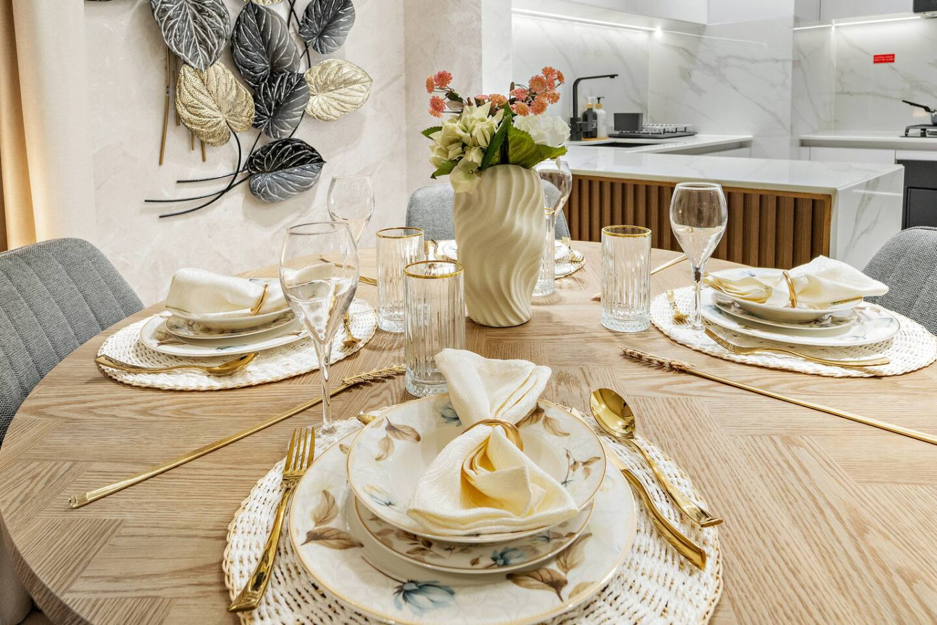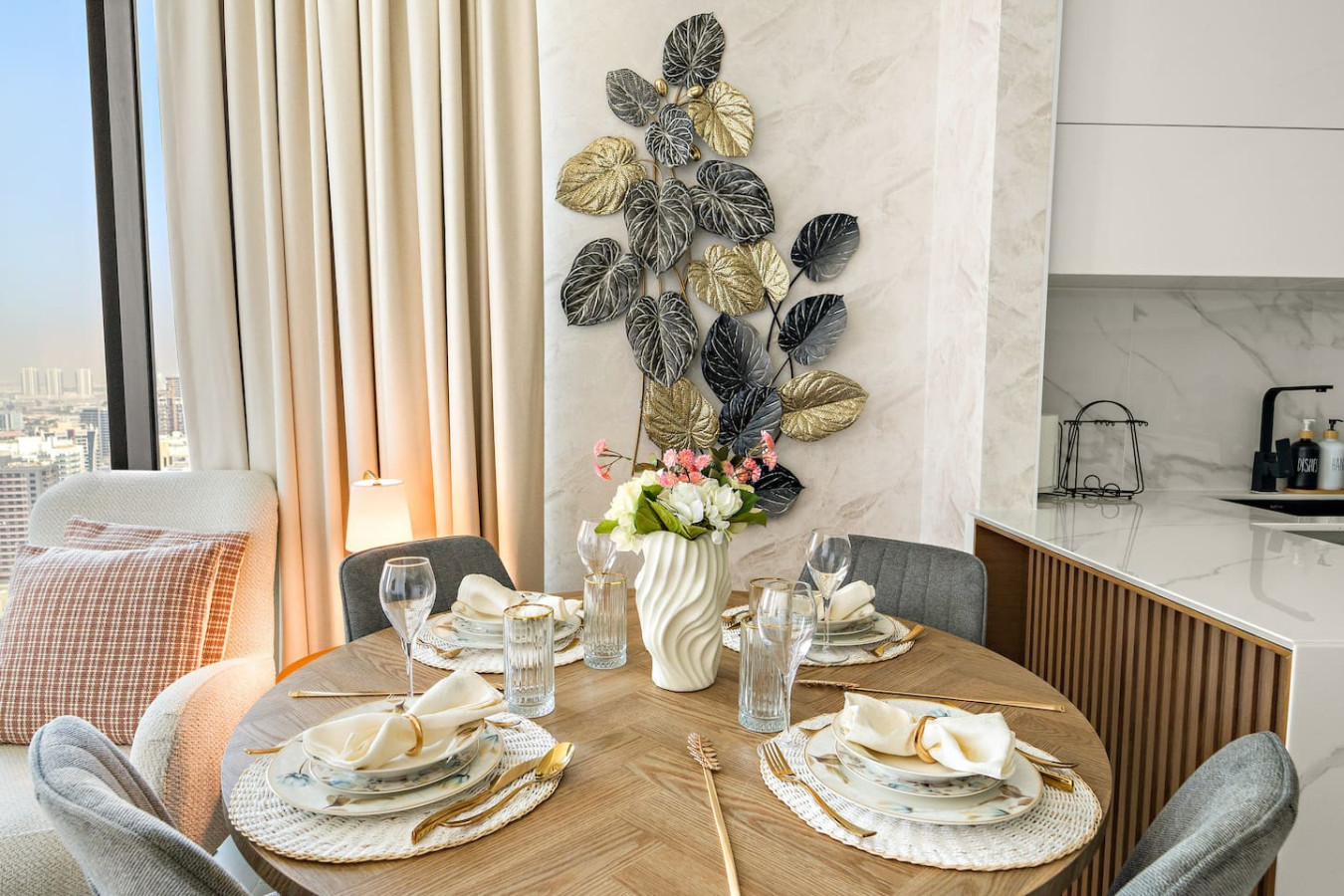 Have a few drinks in the living room while the food is getting ready. Once it’s done, serve it at the inviting dining table and enjoy a tasty meal with your loved ones.