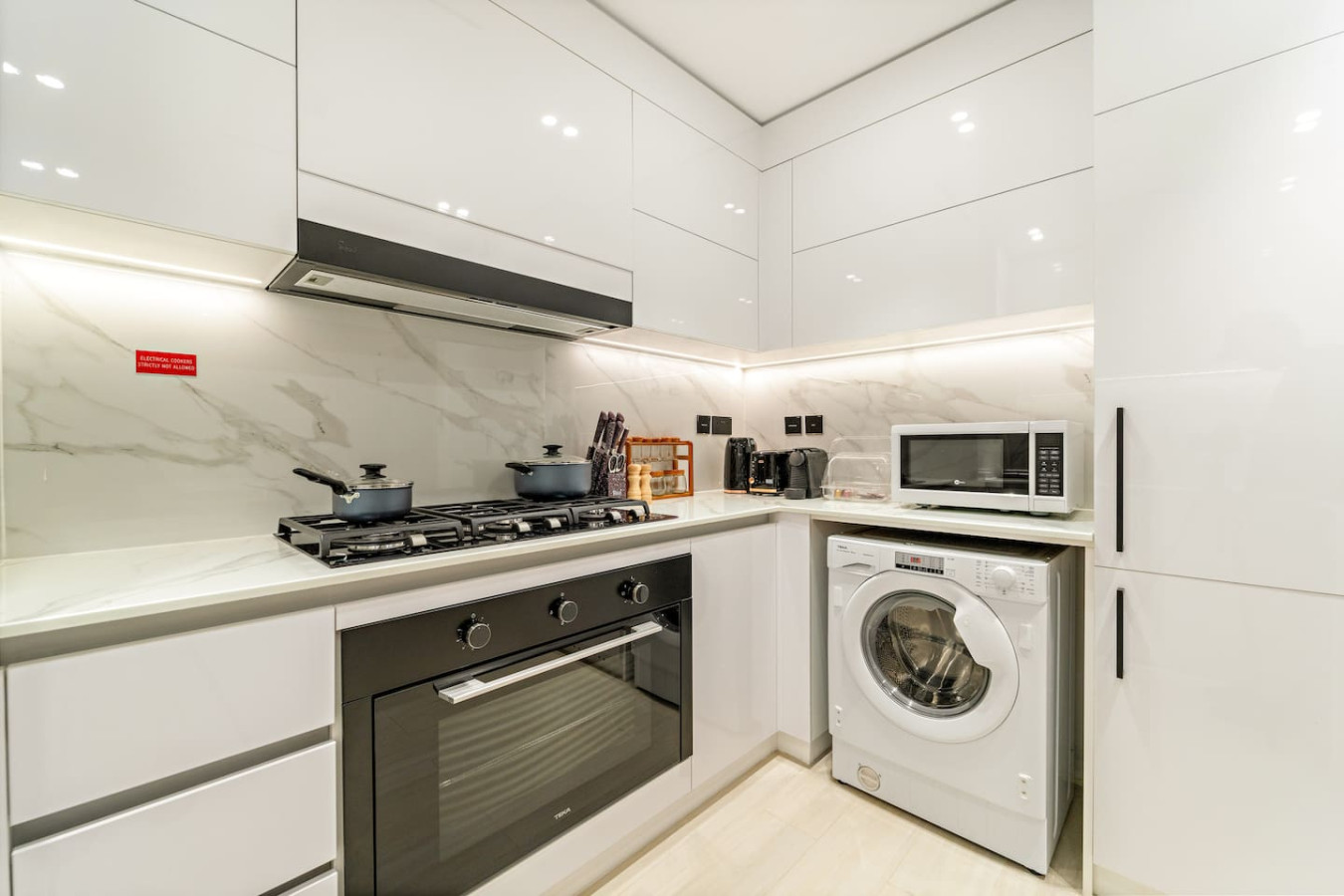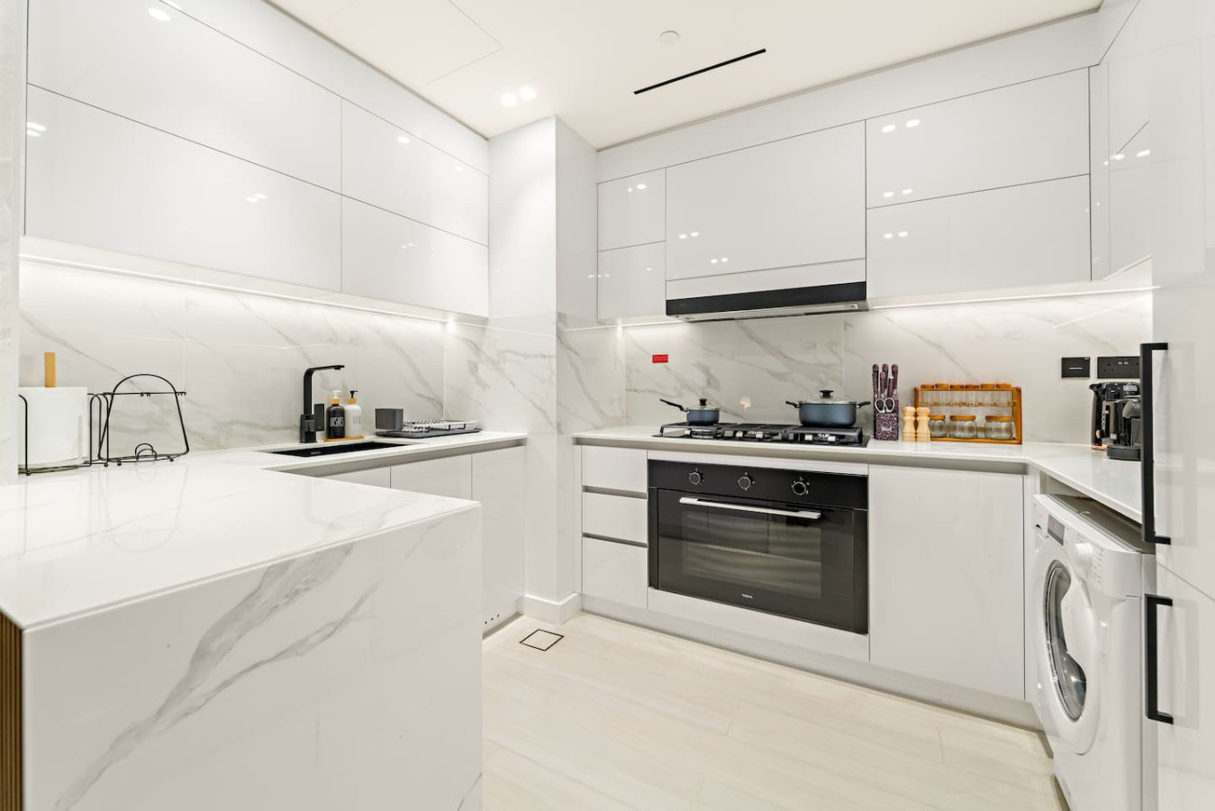It is fully equipped with stainless-steel cooking appliances that make it suitable for preparing any meal, whether a simple breakfast, quick snack or a three-course gourmet dinner. Spacious quartz countertops and a central kitchen island provide plenty of room to work your MasterChef magic.