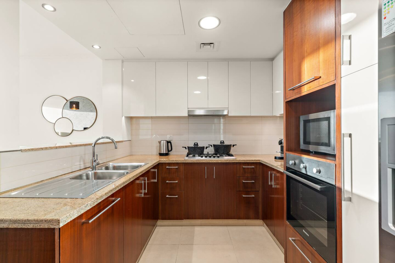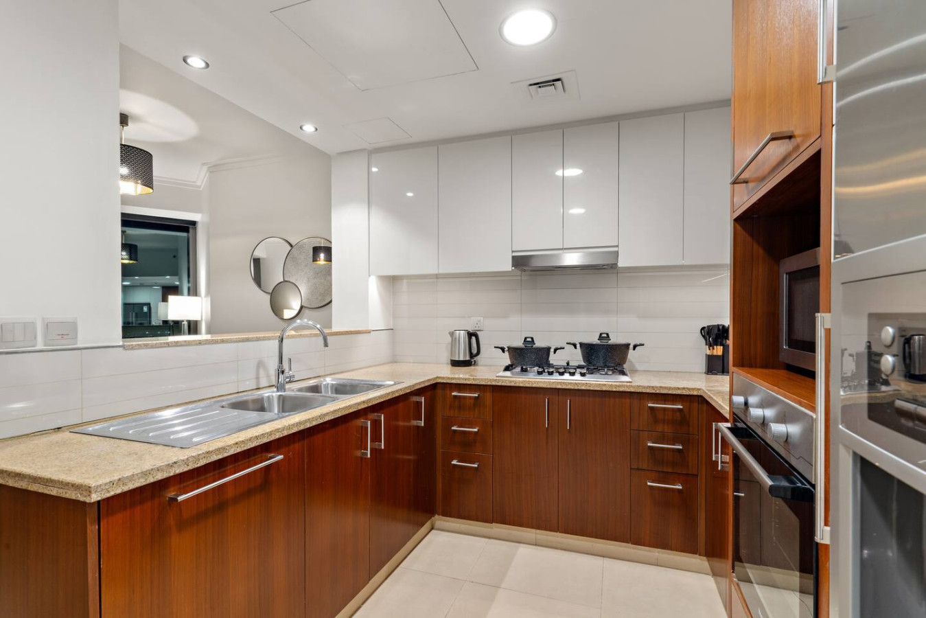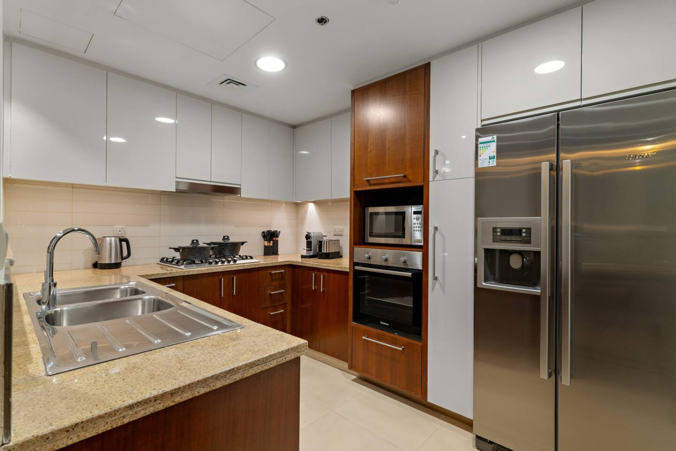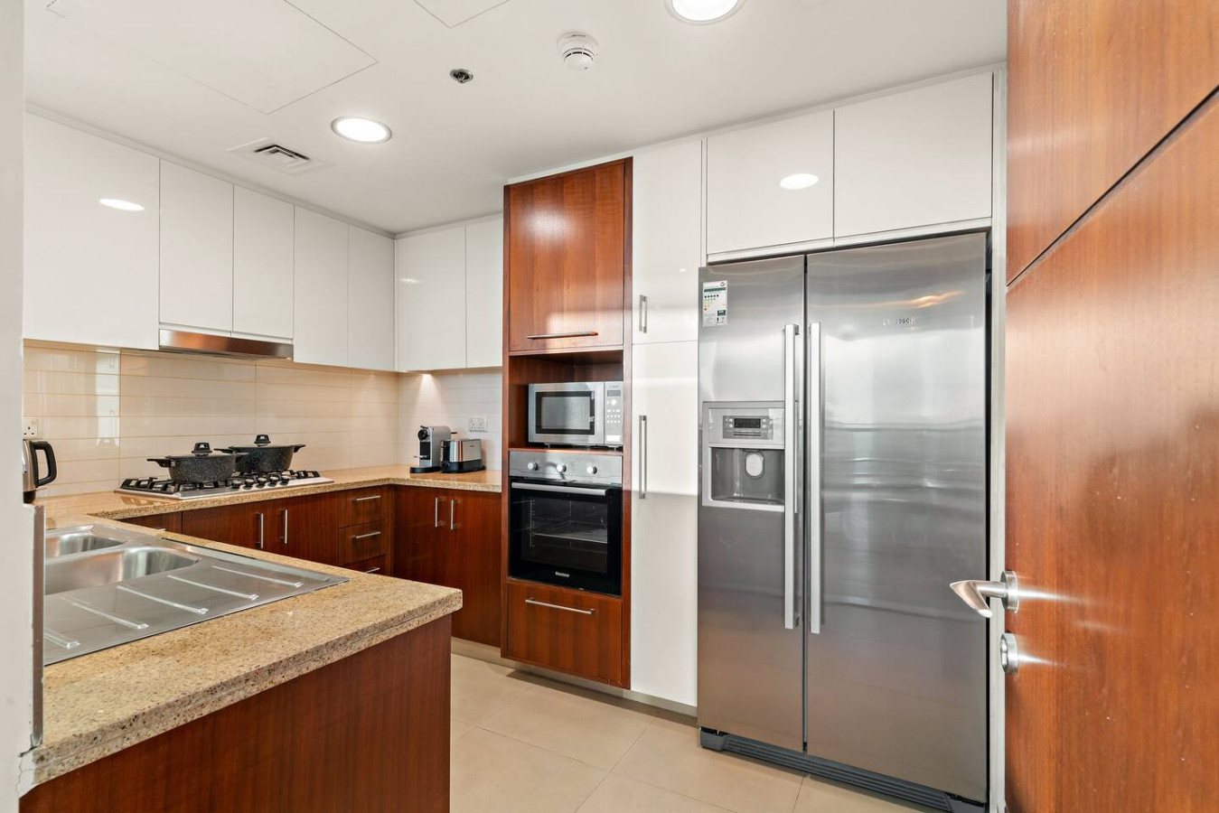 It is fully equipped with stainless-steel cooking appliances that make it suitable for preparing any meal, whether a simple breakfast, quick snack or a three-course gourmet dinner. Spacious quartz countertops and a central kitchen island provide plenty of room to work your MasterChef magic.