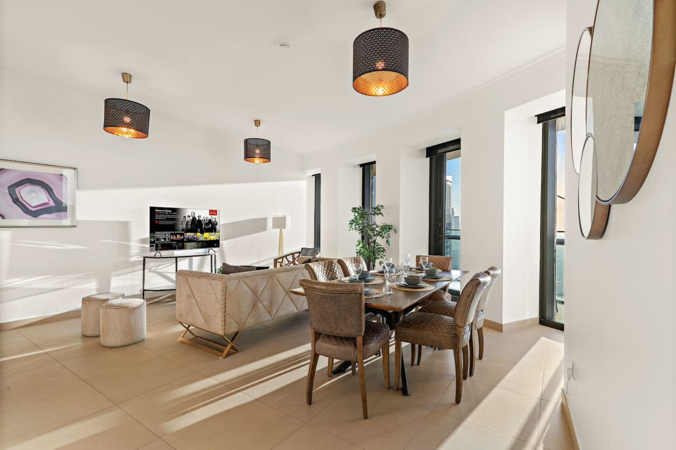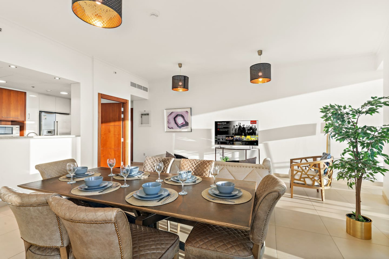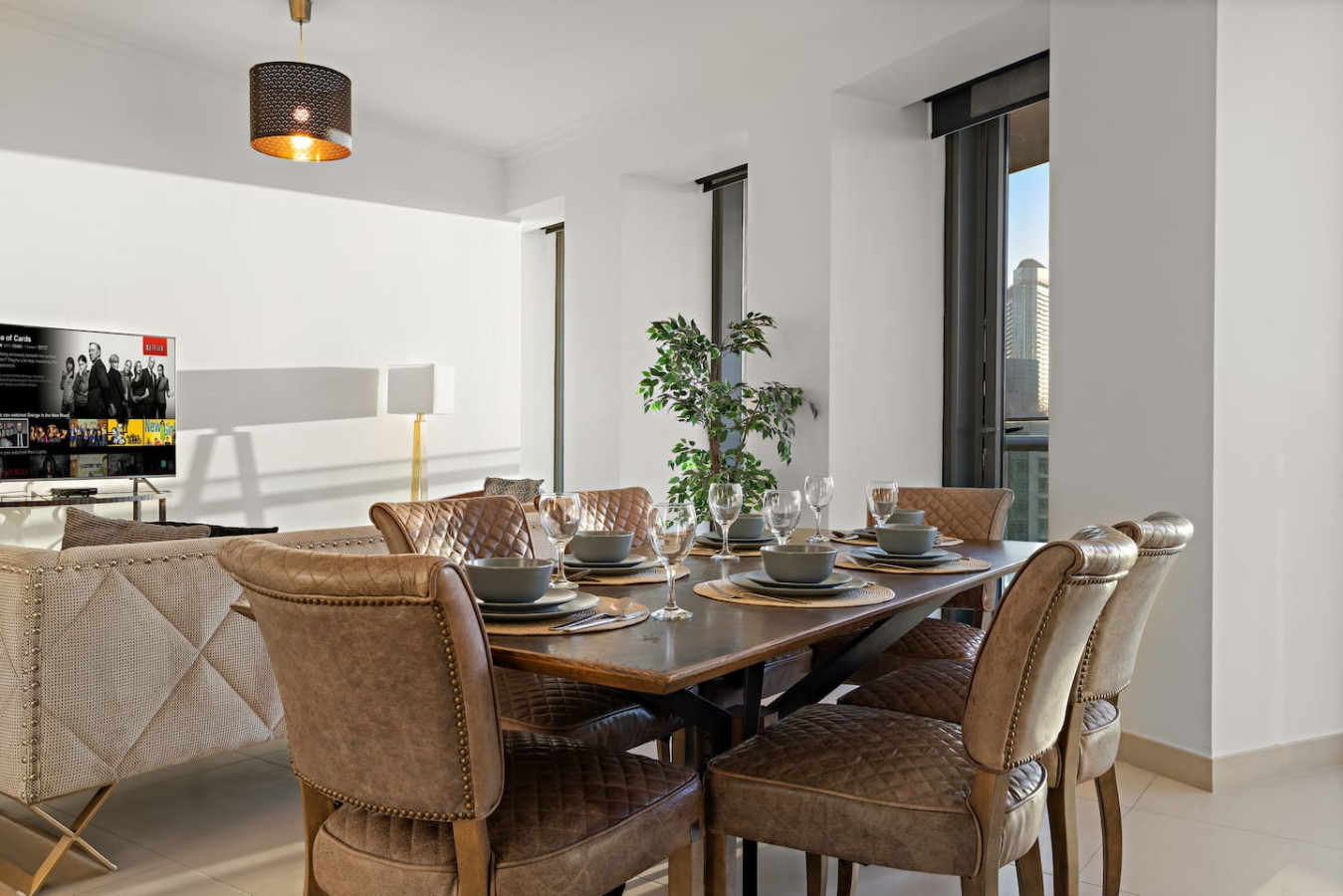 Have a few drinks in the living room while the food is getting ready. Once it’s done, serve it at the inviting dining table and enjoy a tasty meal with your loved ones.