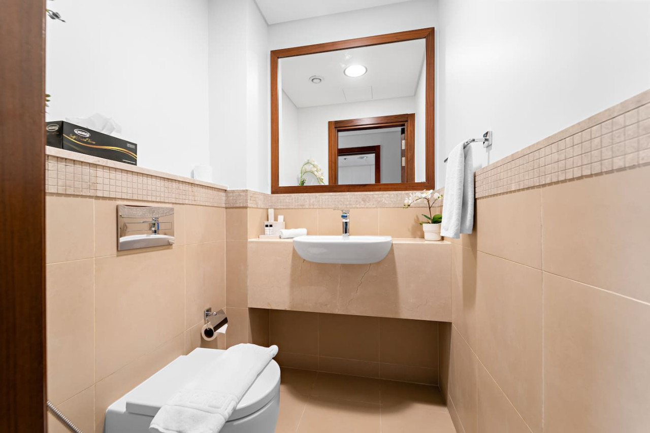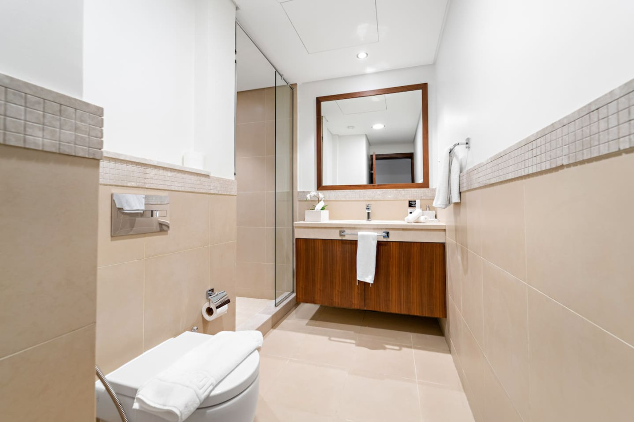 The bathroom is stocked with fresh towels and essential toiletries, so you don’t have to worry about bringing your own.