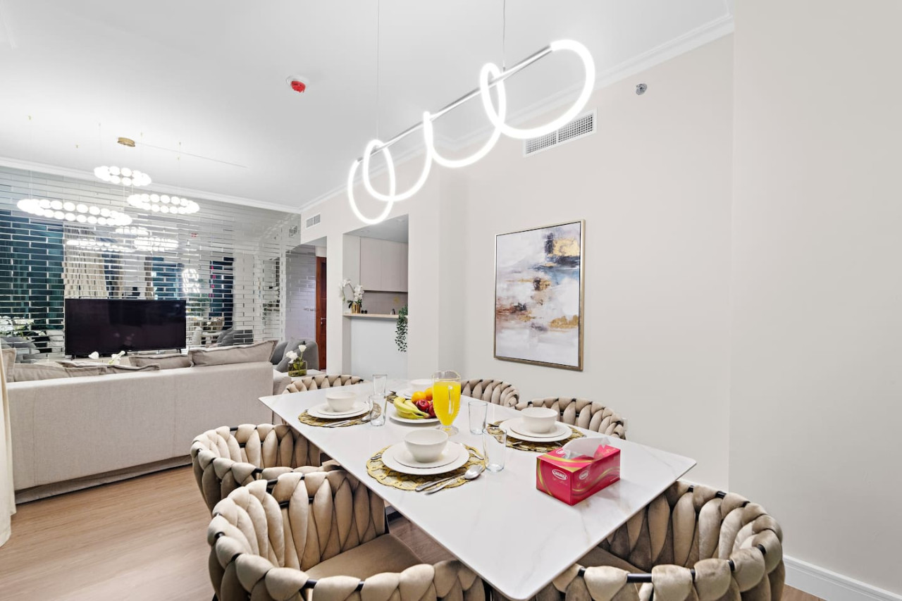 This luxuriously designed apartment has a direct full view from the balcony on the tallest building in the world Burj Khalifa and the famous dancing fountains. The apartment has a direct link to the Dubai Mall and Metro and 2 Swimming pools, gymnasium, games room with pool tables & football tables and a tennis court.