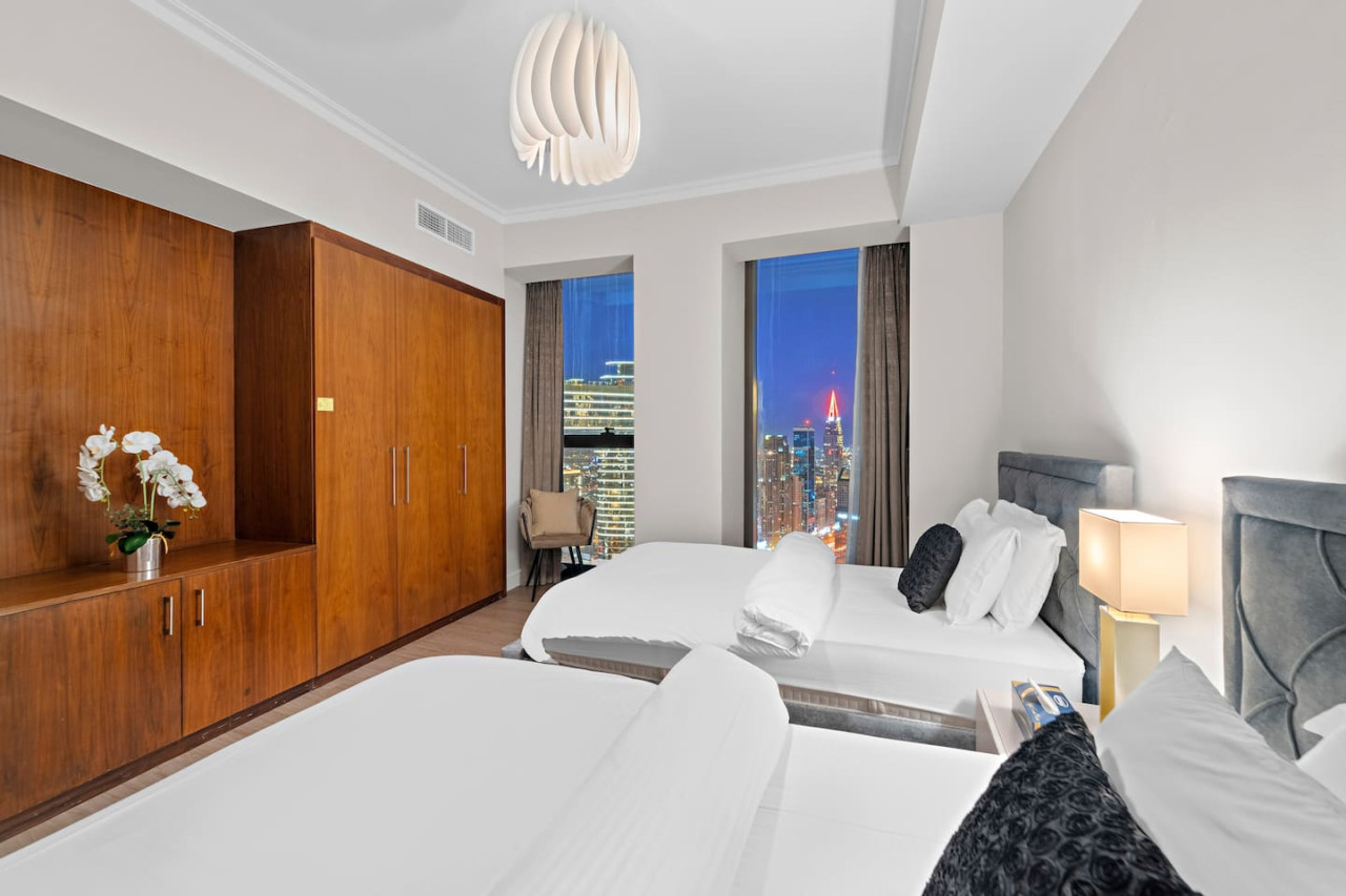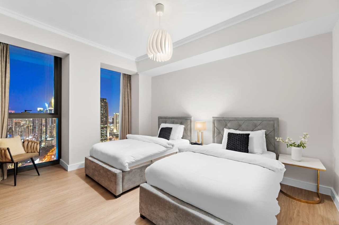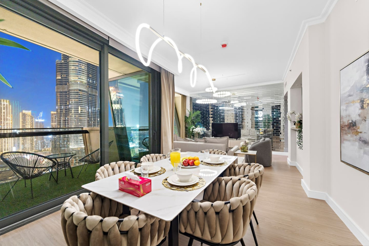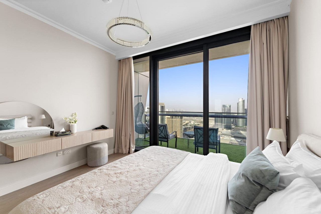 This newly furnished four bedroom apartment is located in one of the most premium buildings in Downtown Dubai – Burj Vista! This newly furnished apartment exemplifies the glamour and luxurious lifestyle of Dubai. It is literally located right across the road from the Burj Khalifa which is the tallest tower in the world! Also, the tower is connected to Dubai Mall (the world largest mall) via and indoor bridge! Wait till you see the rest of the facilities which include a fitness center, tennis courts, kids area, squash courts etc. This welcoming space draws you in with its refreshing colour palette, allowing you to energize and rejuvenate yourself. The flawless space consists of three majestic bedrooms with built-in wardrobes for your convenience, a kids bedroom, a living room, a terrace accompanied by the breathtaking views on the worlds tallest tower – The Burj Khalifa, the Dubai Mall, Dubai Fountain along with Downtown Dubai, and a state-of-the-art kitchen which is fully equipped with high-end appliances and a handy service window to the dining area, making it easy to serve up your favorite dishes. Our apartments are exclusively designed for your optimal privacy, we offer video intercom access, pool, fully-equipped gymnasium and for your safety and protection 24 hours’ security available in the building. Our apartments are rented solely for our guests thus, you have a key card system which allows you to utilize the private building parking, following an elevator straight to your apartment. The apartment itself is secluded and offers you prime privacy for your relaxation. As soon as you arrive you will be welcomed by our guest experience manager, who will be at your service 24 hours a day regarding any matter. One day prior to your departure I will contact you for your check out details. As we truly respect your privacy we will not cause any disturbance to you during your stay, until and unless you have requested it.