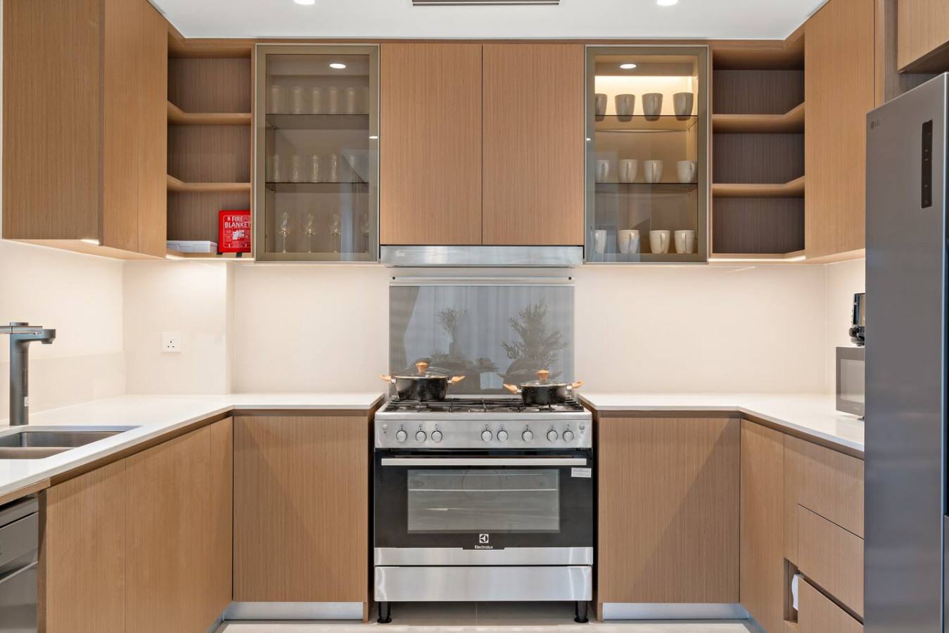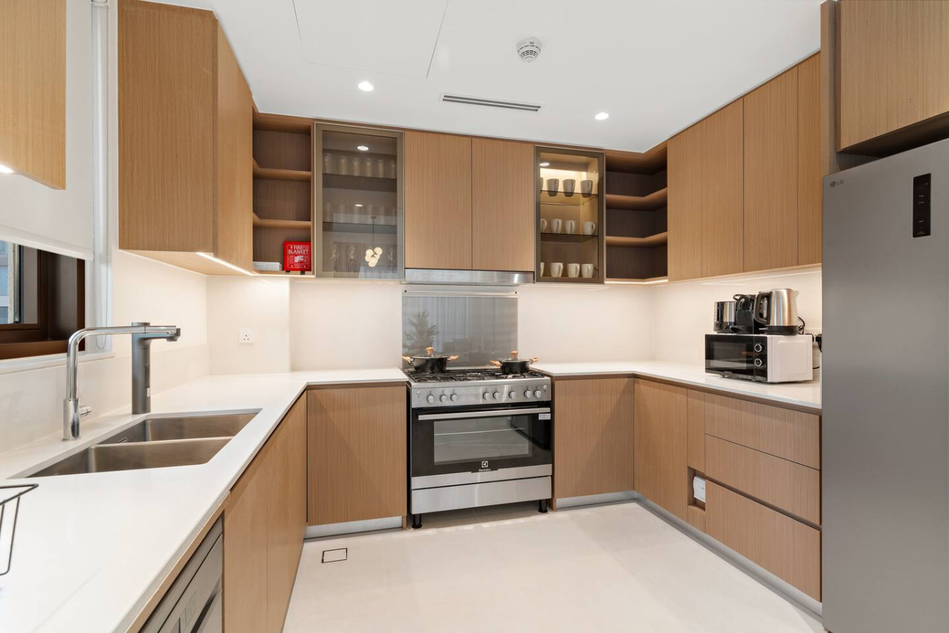 It is fully equipped with stainless-steel cooking appliances that make it suitable for preparing any meal, whether a simple breakfast, quick snack or a three-course gourmet dinner. Spacious quartz countertops and a central kitchen island provide plenty of room to work your MasterChef magic.