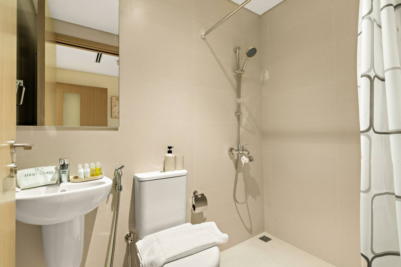 The bathroom is stocked with fresh towels and essential toiletries, so you don’t have to worry about bringing your own.