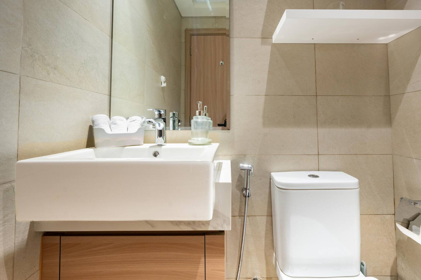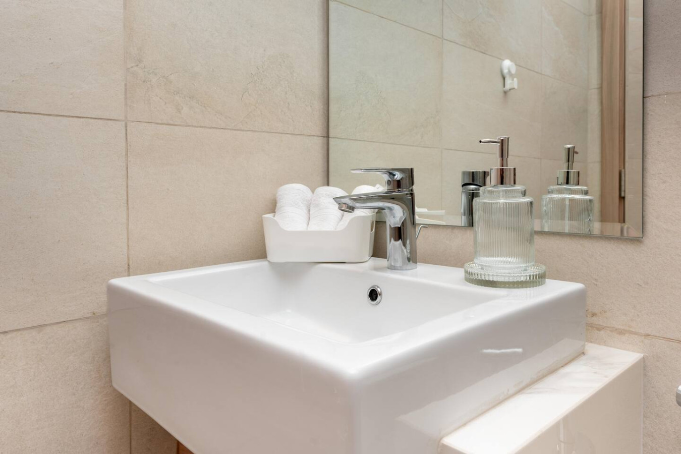 The bathroom is stocked with fresh towels and essential toiletries, so you don’t have to worry about bringing your own.