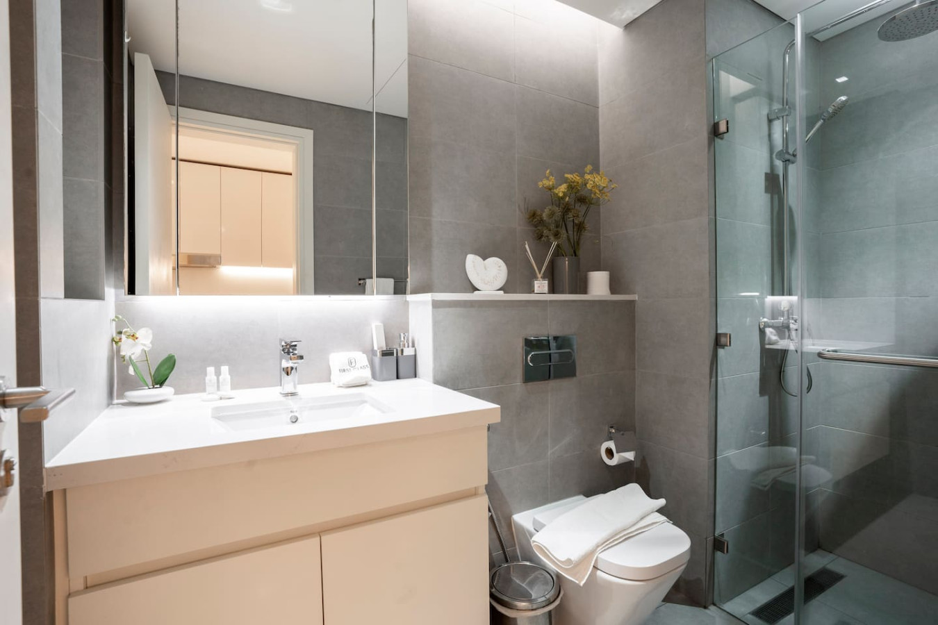 The bathroom is stocked with fresh towels and essential toiletries, so you don’t have to worry about bringing your own.
