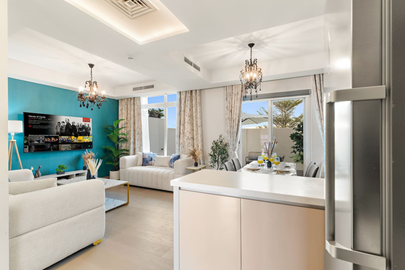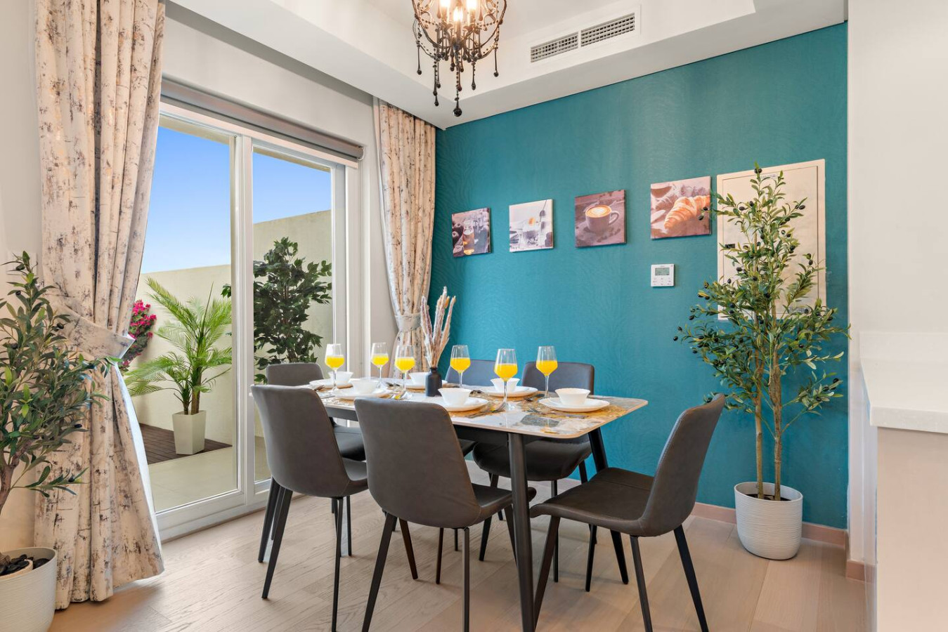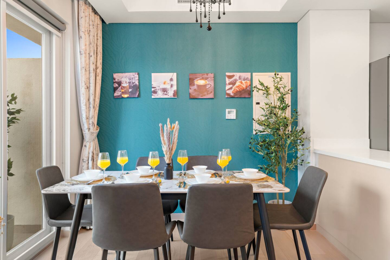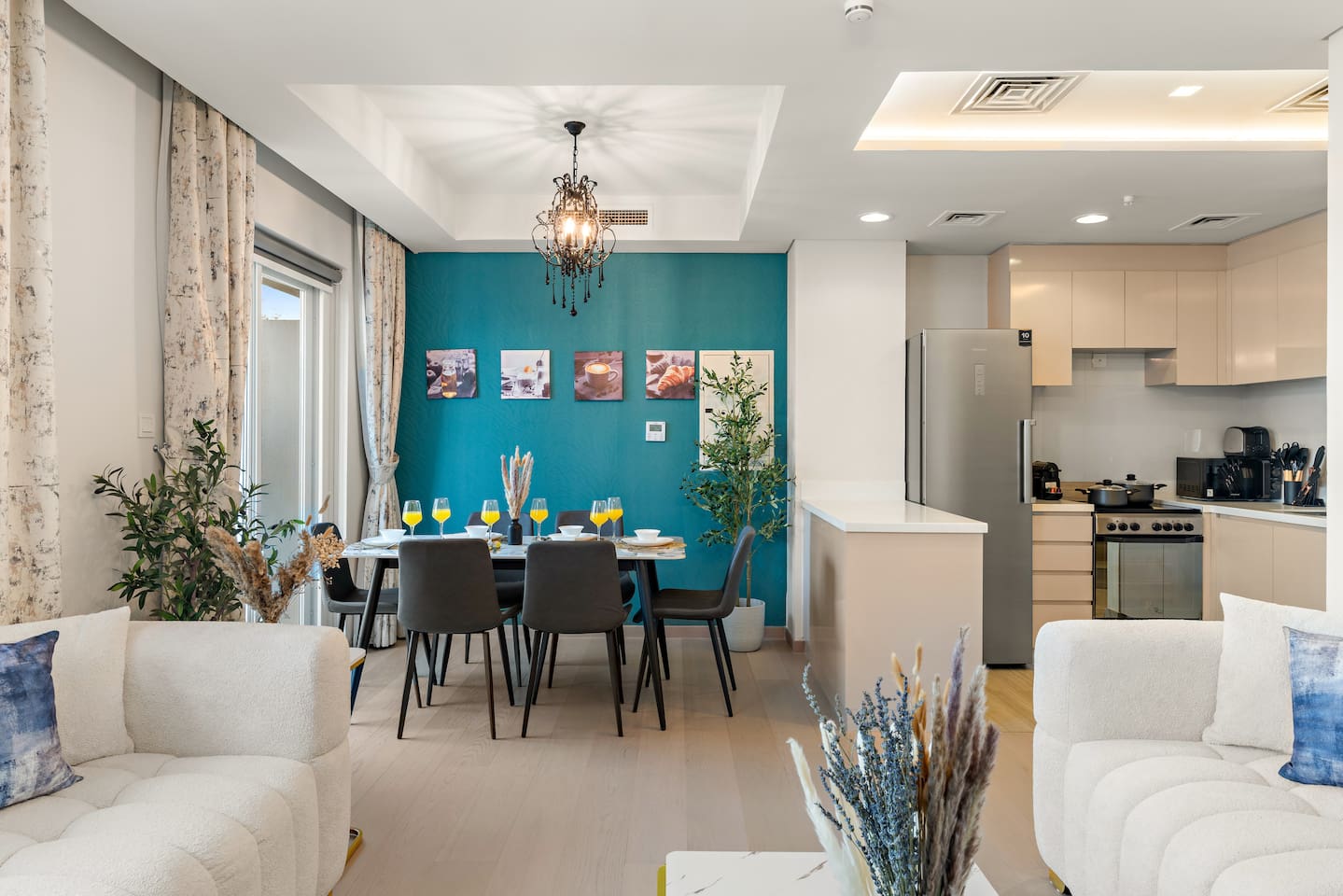 Have a few drinks in the living room while the food is getting ready. Once it’s done, serve it at the inviting dining table and enjoy a tasty meal with your loved ones.