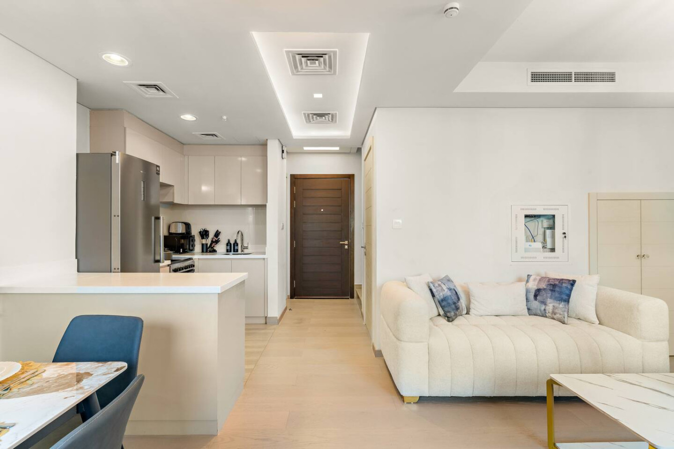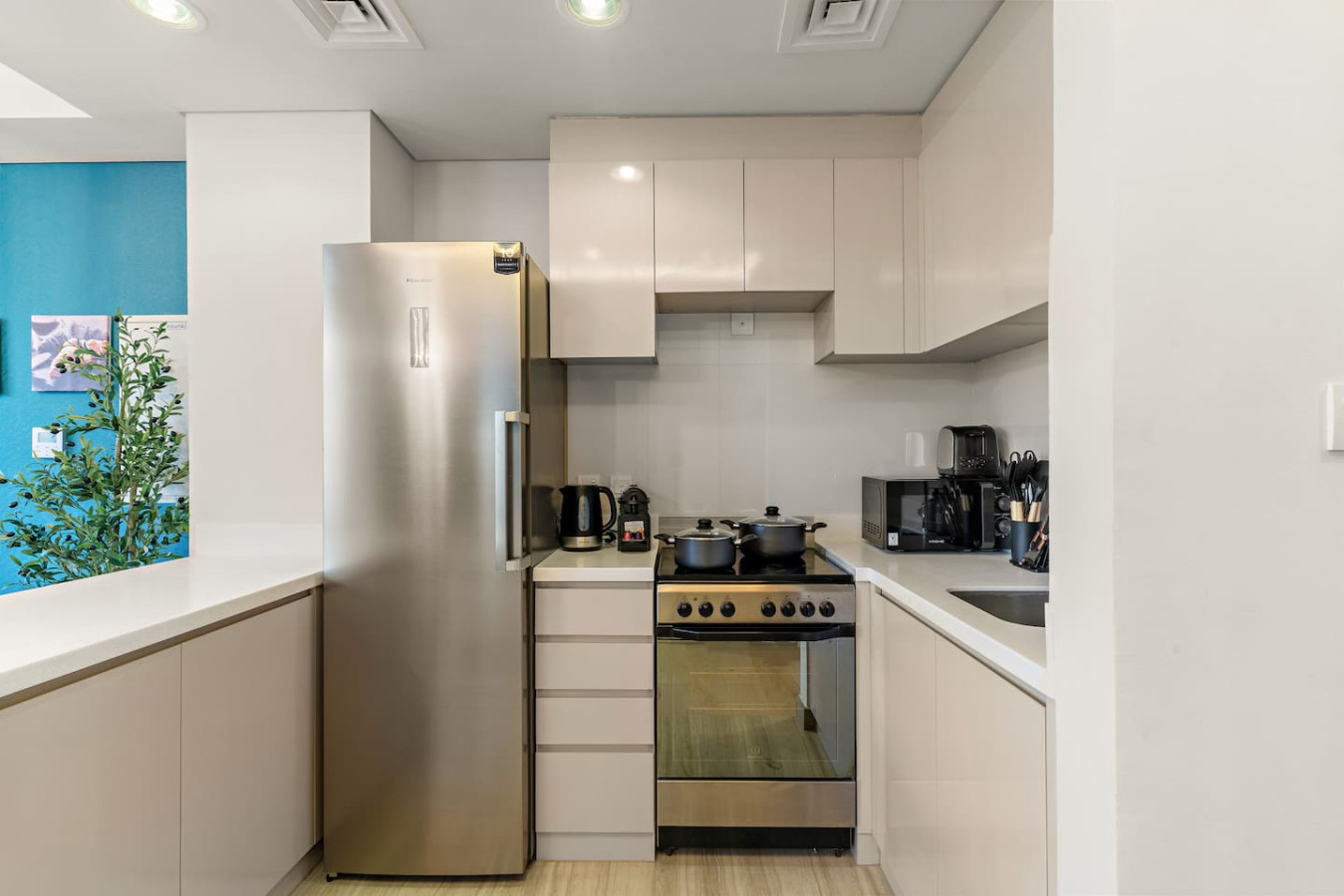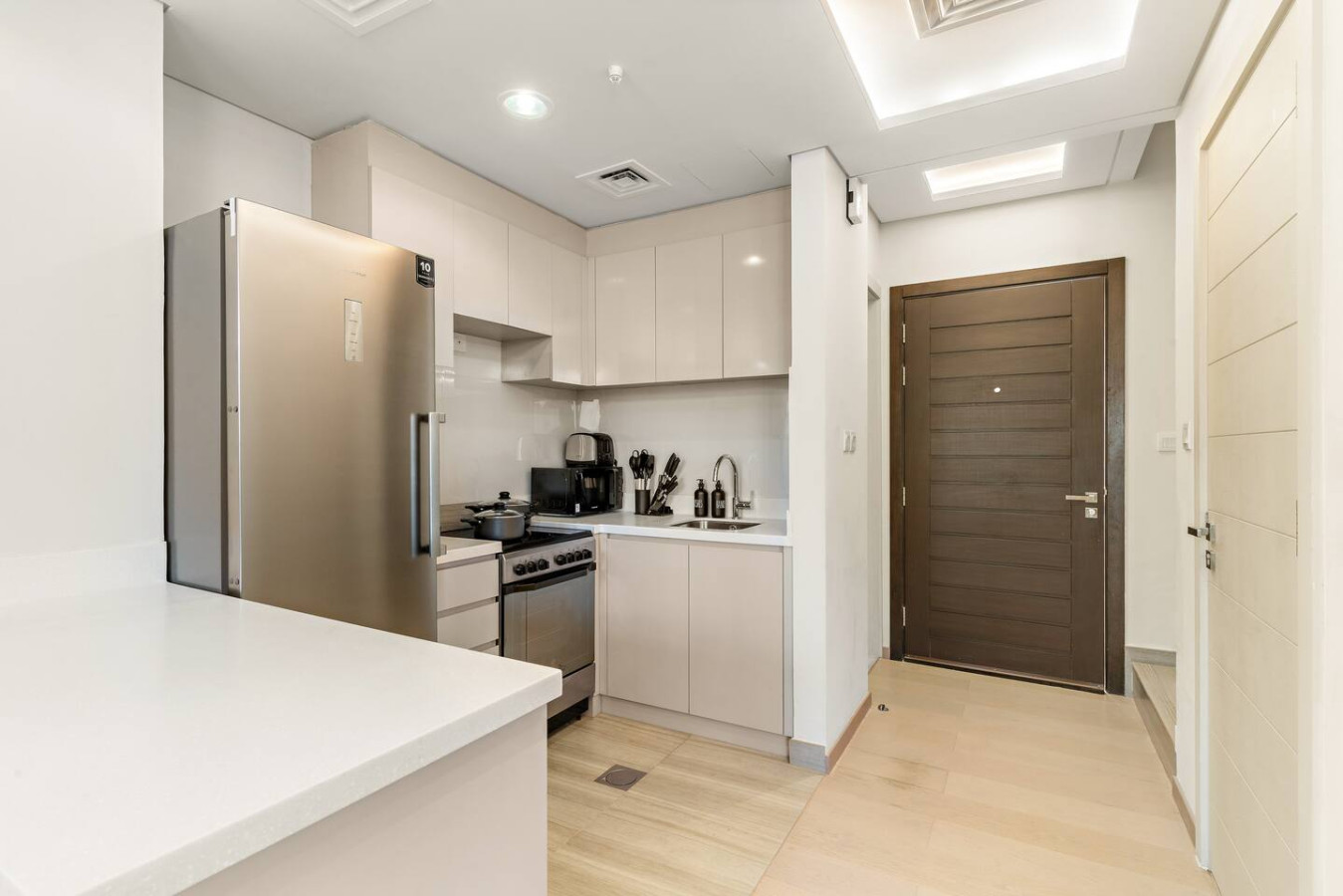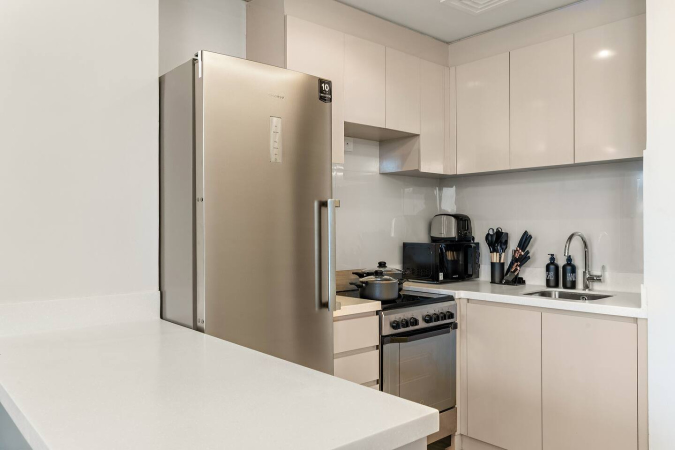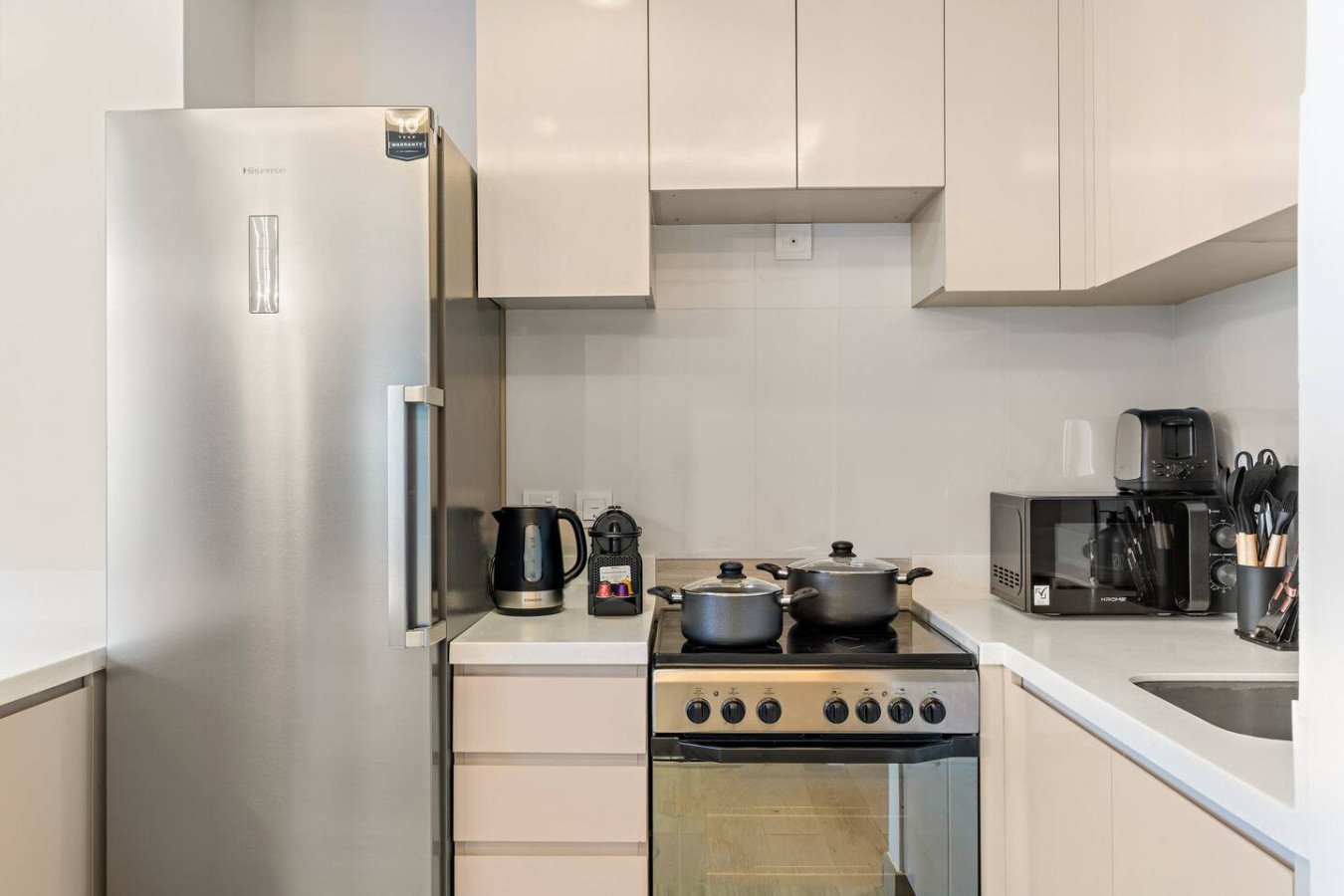 It is fully equipped with stainless-steel cooking appliances that make it suitable for preparing any meal, whether a simple breakfast, quick snack or a three-course gourmet dinner. Spacious quartz countertops and a central kitchen island provide plenty of room to work your MasterChef magic.