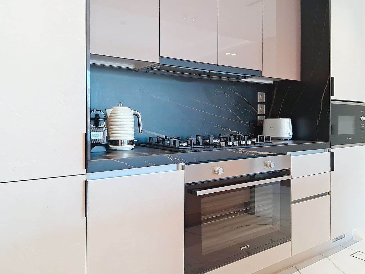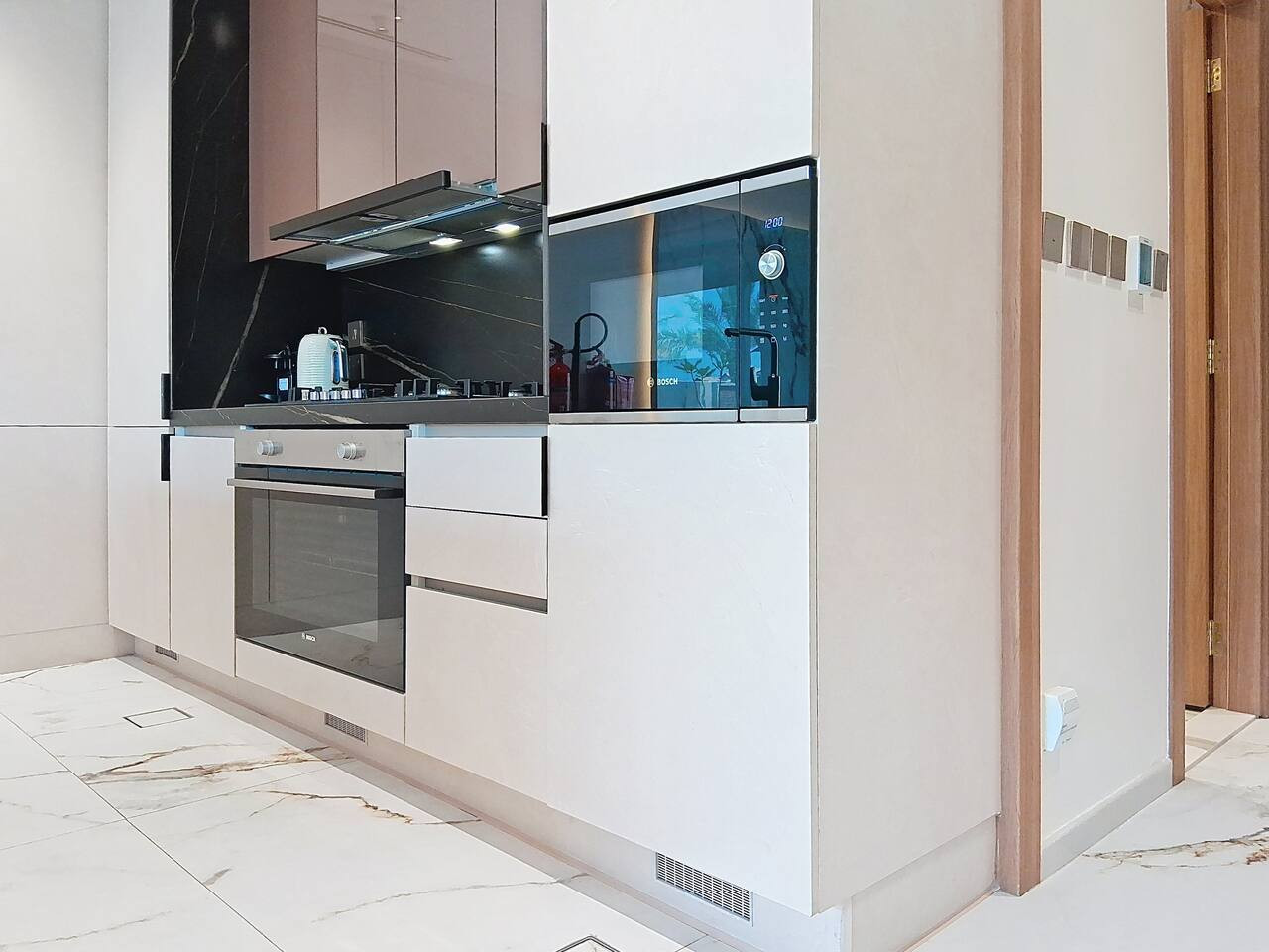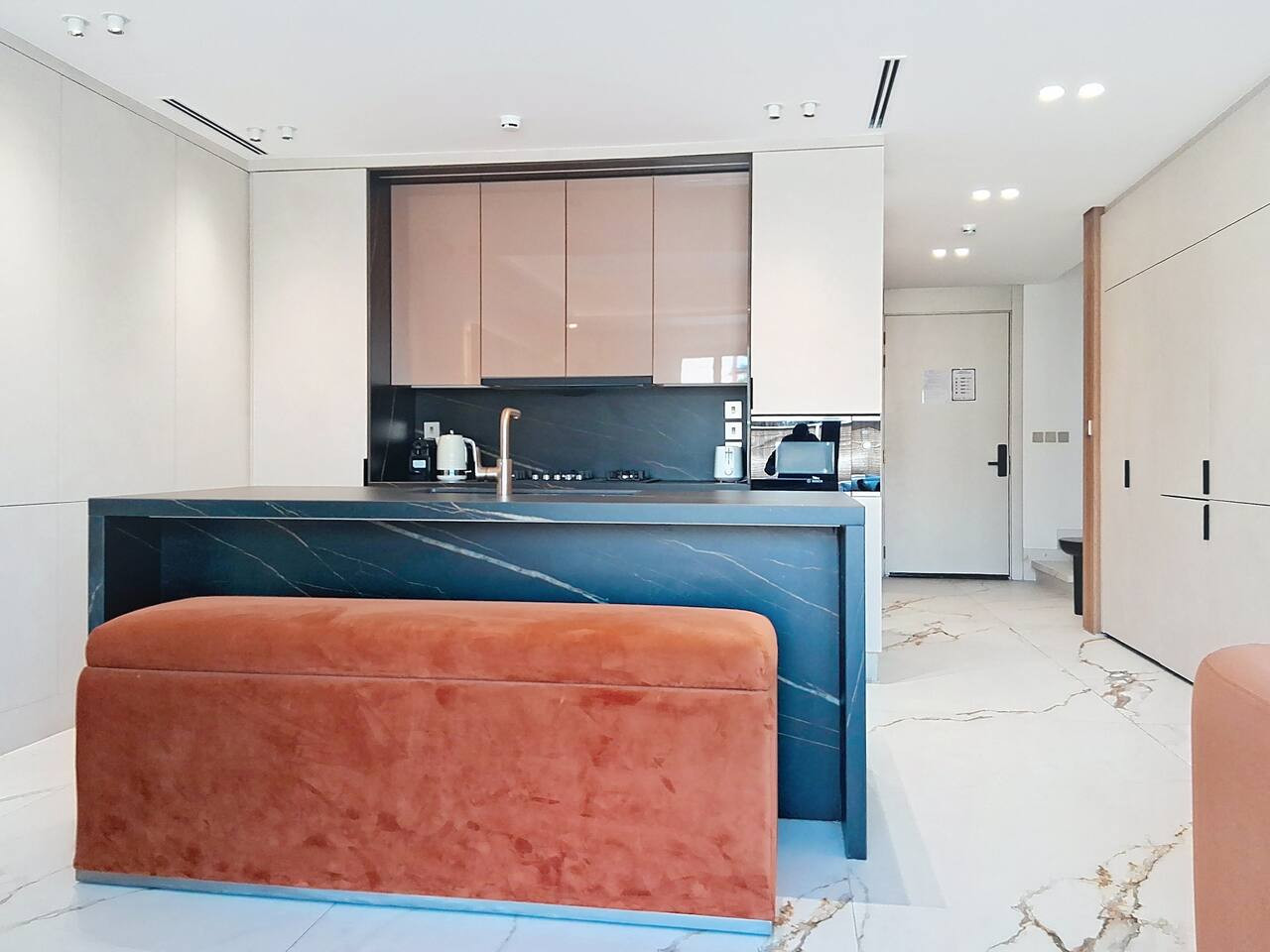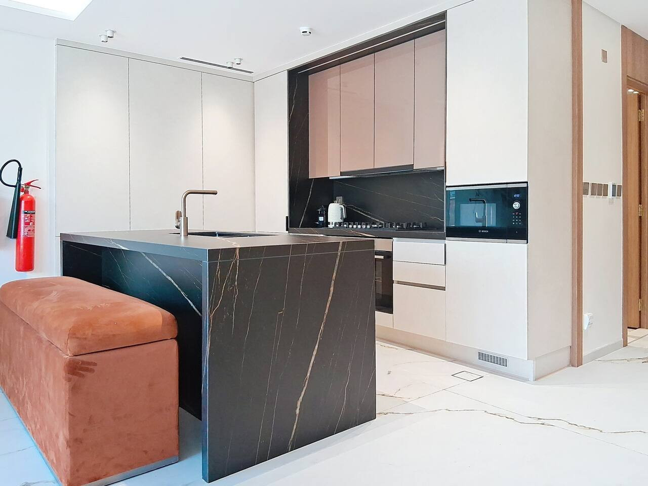 – Sleek, modern kitchenette fully equipped with all essential appliances, plus a coffee machine and dishwasher for added comfort and convenience