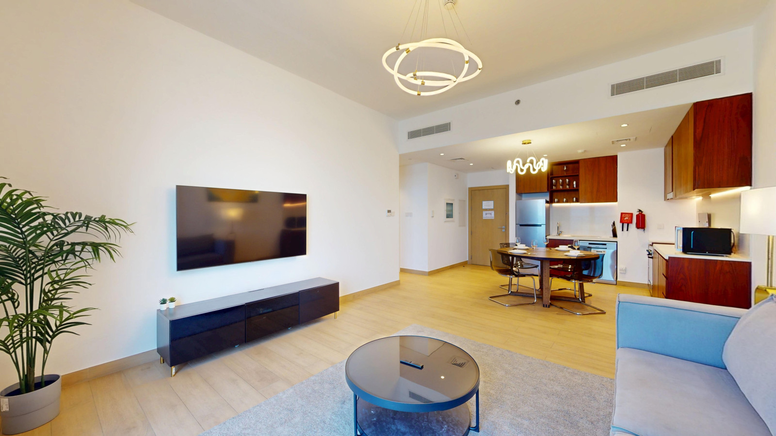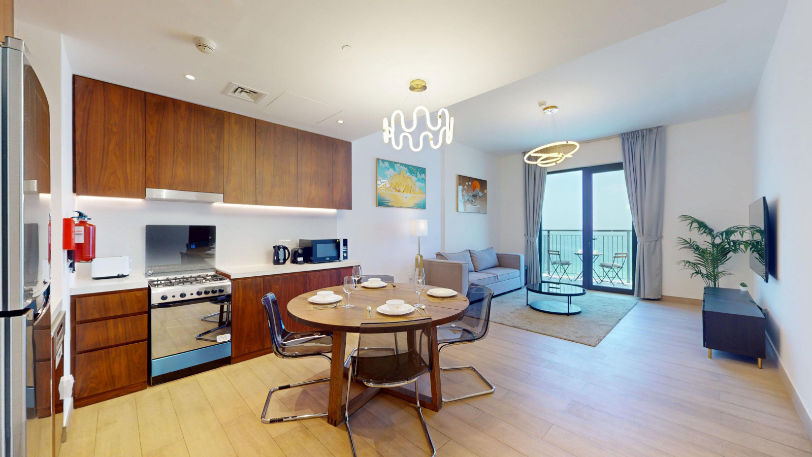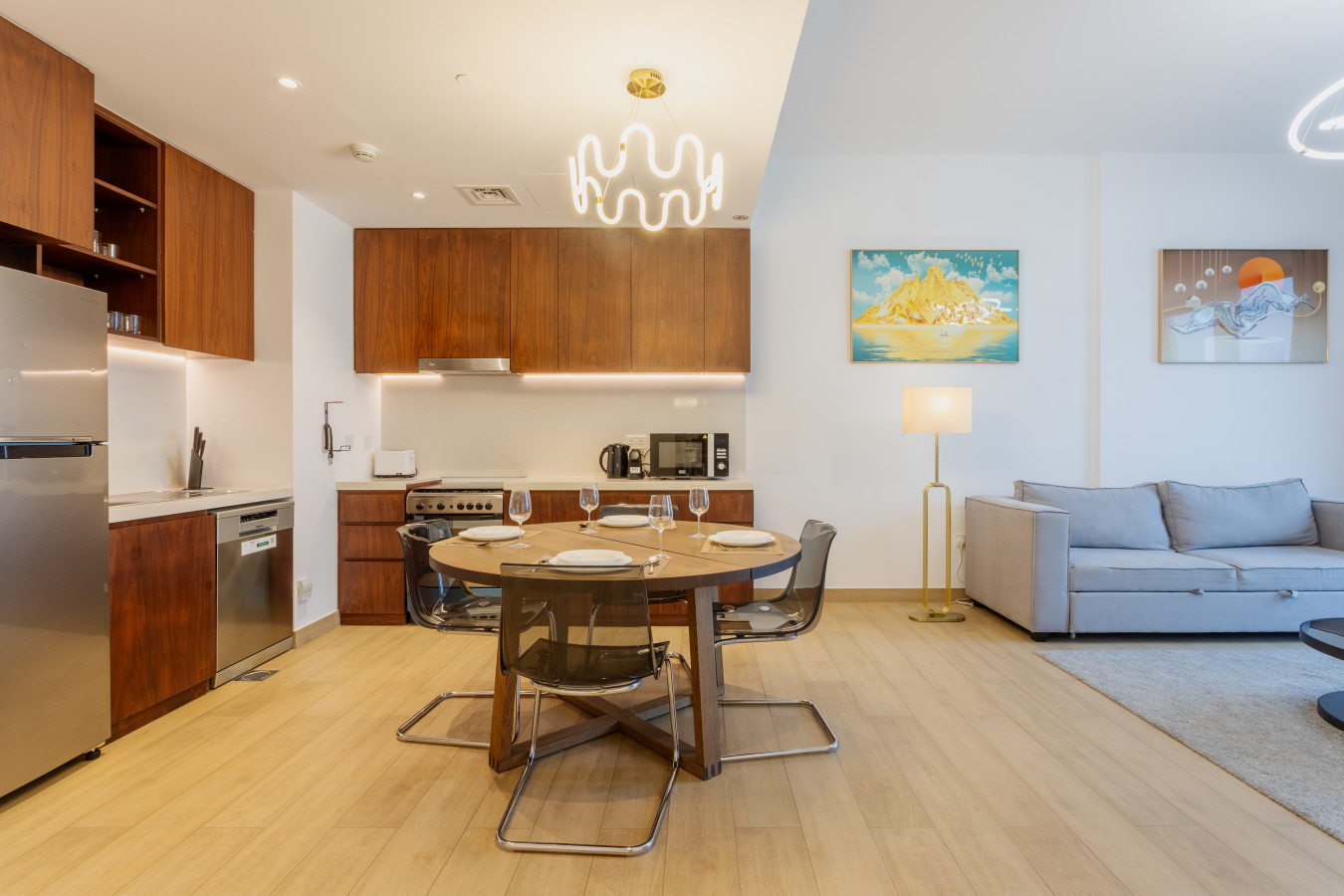 The open-plan living and dining space features a fully equipped kitchen with a fridge, oven, gas stove, coffee machine, and dishwasher. A round dining table comfortably seats four, and the living area is fitted with plush two seater sofa that can be converted to a sofa bed and a Smart TV for entertainment.