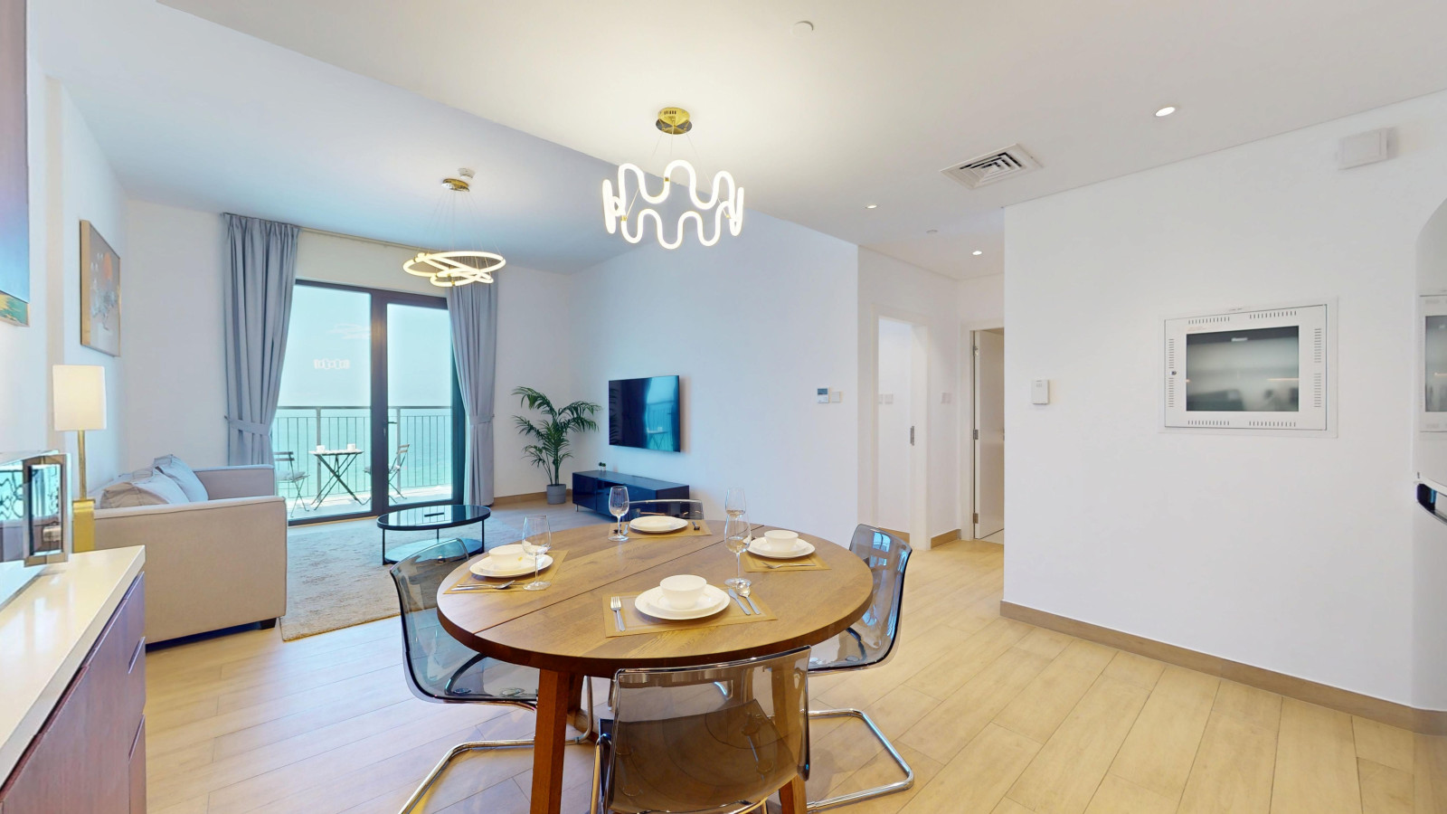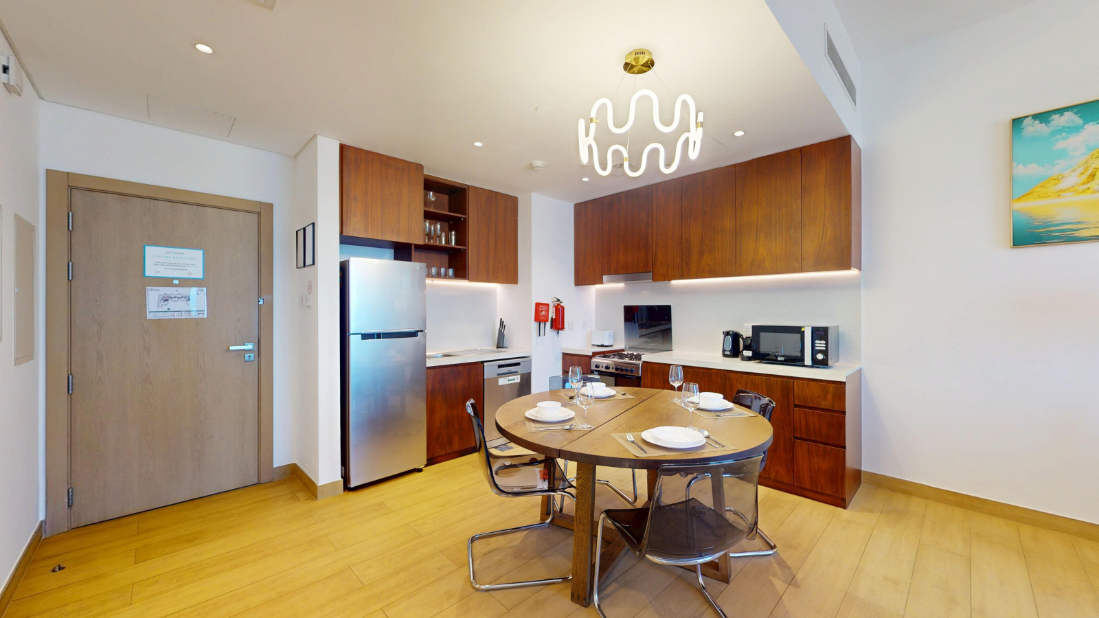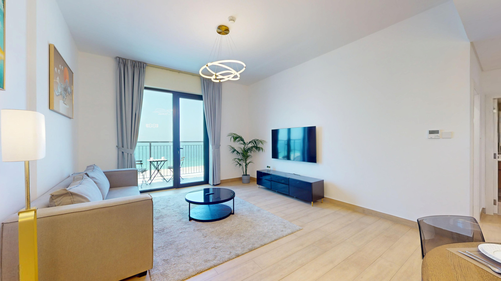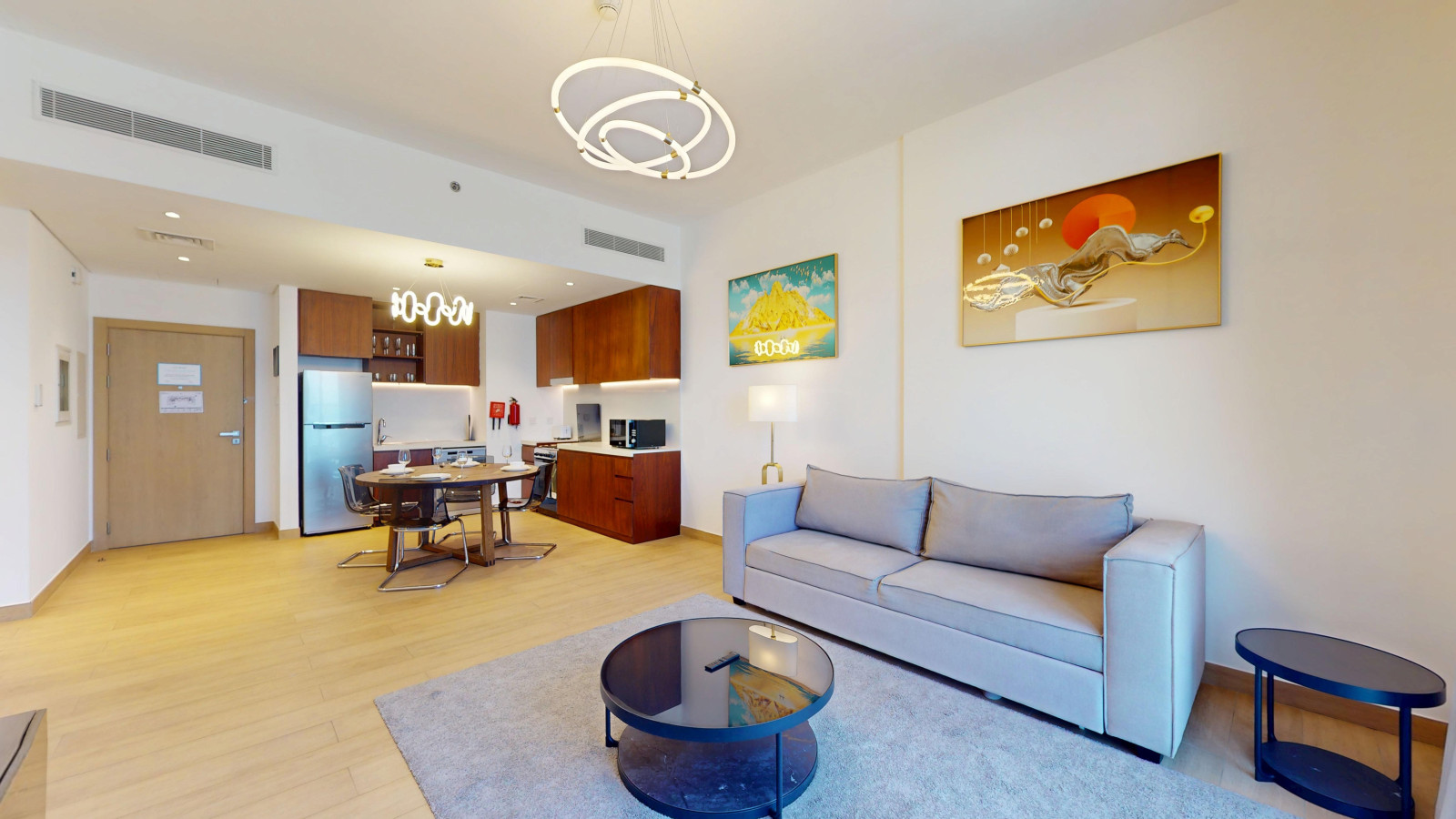The open-plan living and dining space features a fully equipped kitchen with a fridge, oven, gas stove, coffee machine, and dishwasher. A round dining table comfortably seats four, and the living area is fitted with plush two seater sofa that can be converted to a sofa bed and a Smart TV for entertainment.