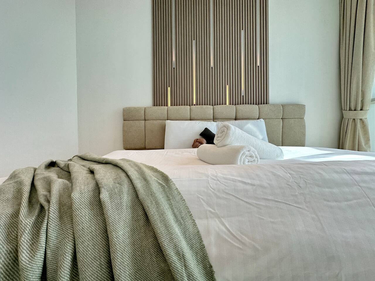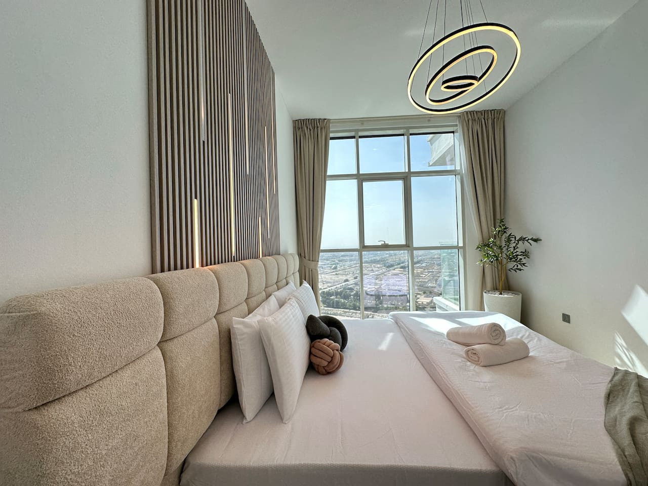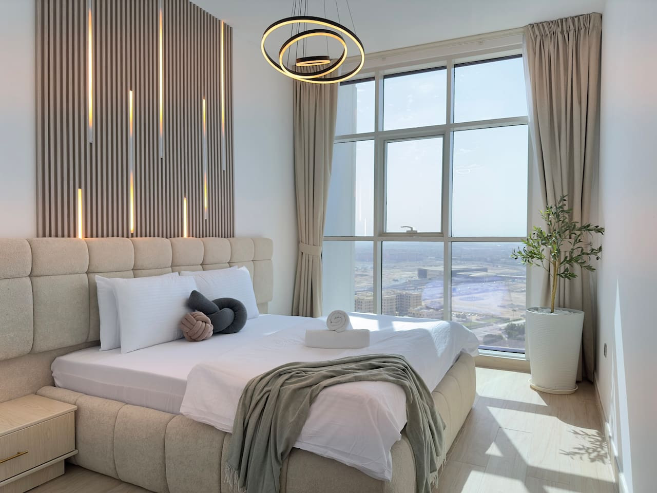 – Bedroom 1: A spacious queen-size bed with premium linens and a large glass window offering views outside.