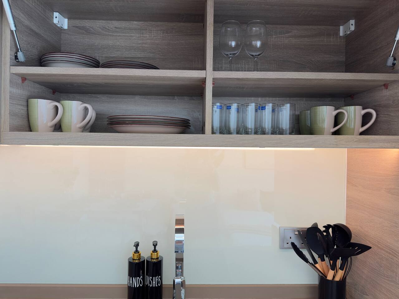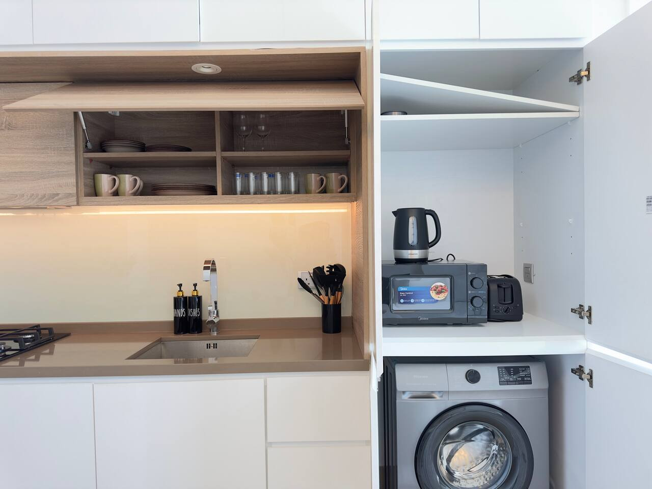 The kitchen is fully equipped with all the essentials needed for a comfortable stay and includes a laundry area.