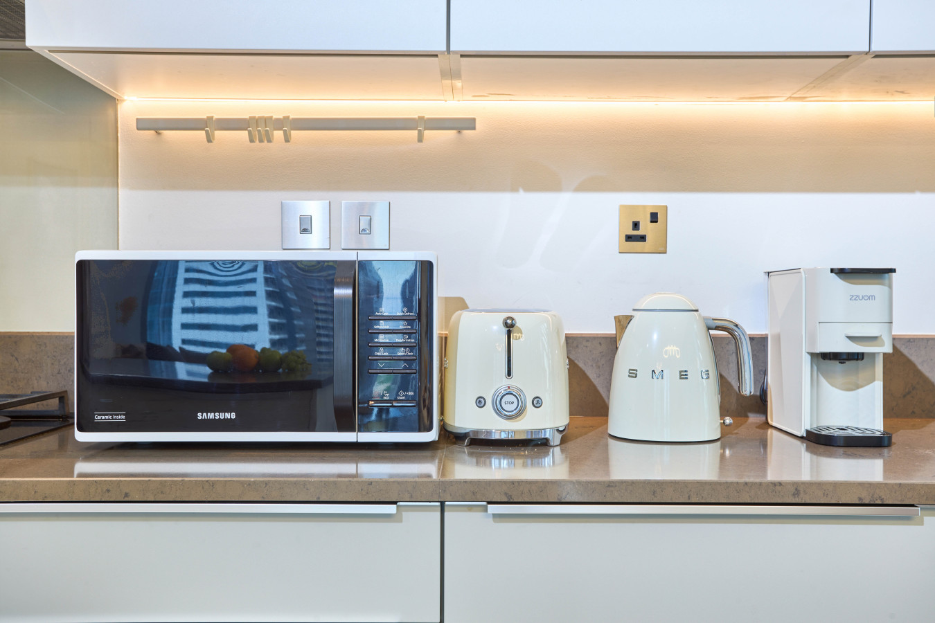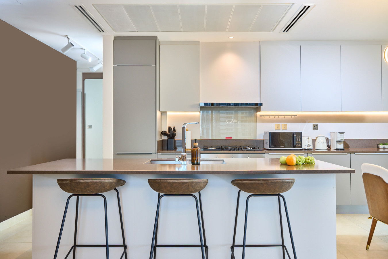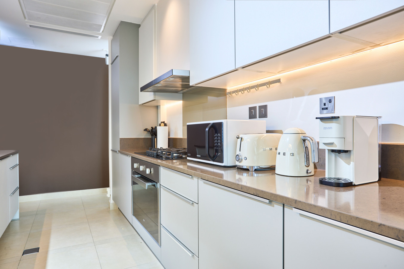 🍳 The fully equipped kitchen features a gas hob, oven, fridge, separate freezer, dishwasher, microwave, toaster, hot water kettle, and a Nespresso machine. A kitchen island with bar stools makes it perfect for casual dining or a quiet morning coffee overlooking the marina.