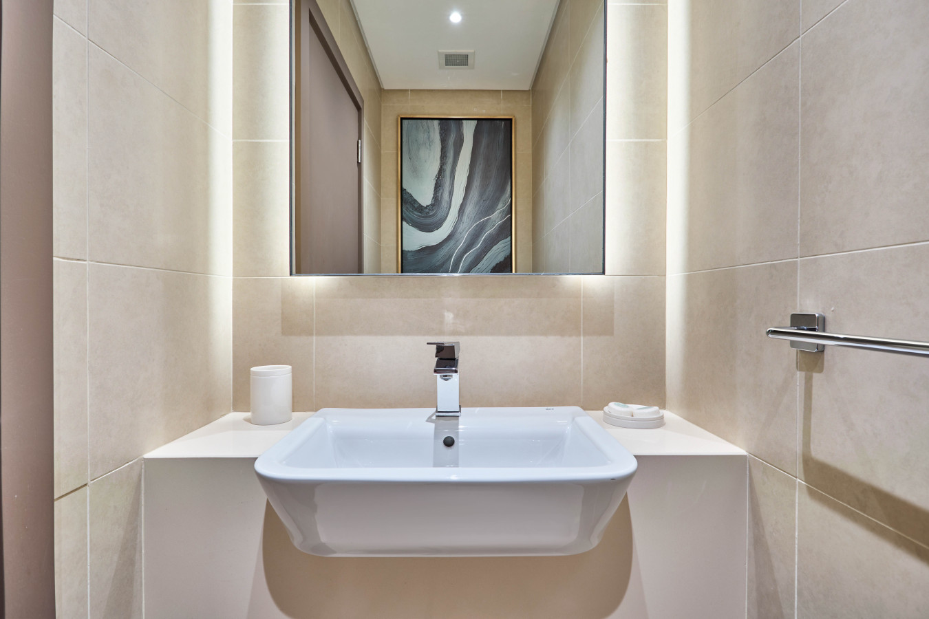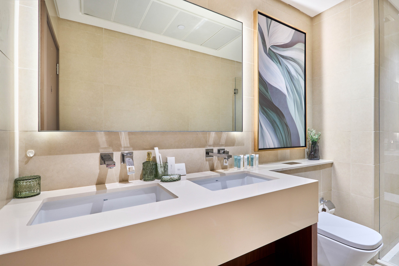 🛏️ The master bedroom features a king-size bed with ample wardrobe storage, while the second bedroom offers a comfortable queen-size bed. Both bedrooms come with their own private en-suite bathroom with shower. A separate powder room adds extra convenience for larger groups and families visiting Dubai.