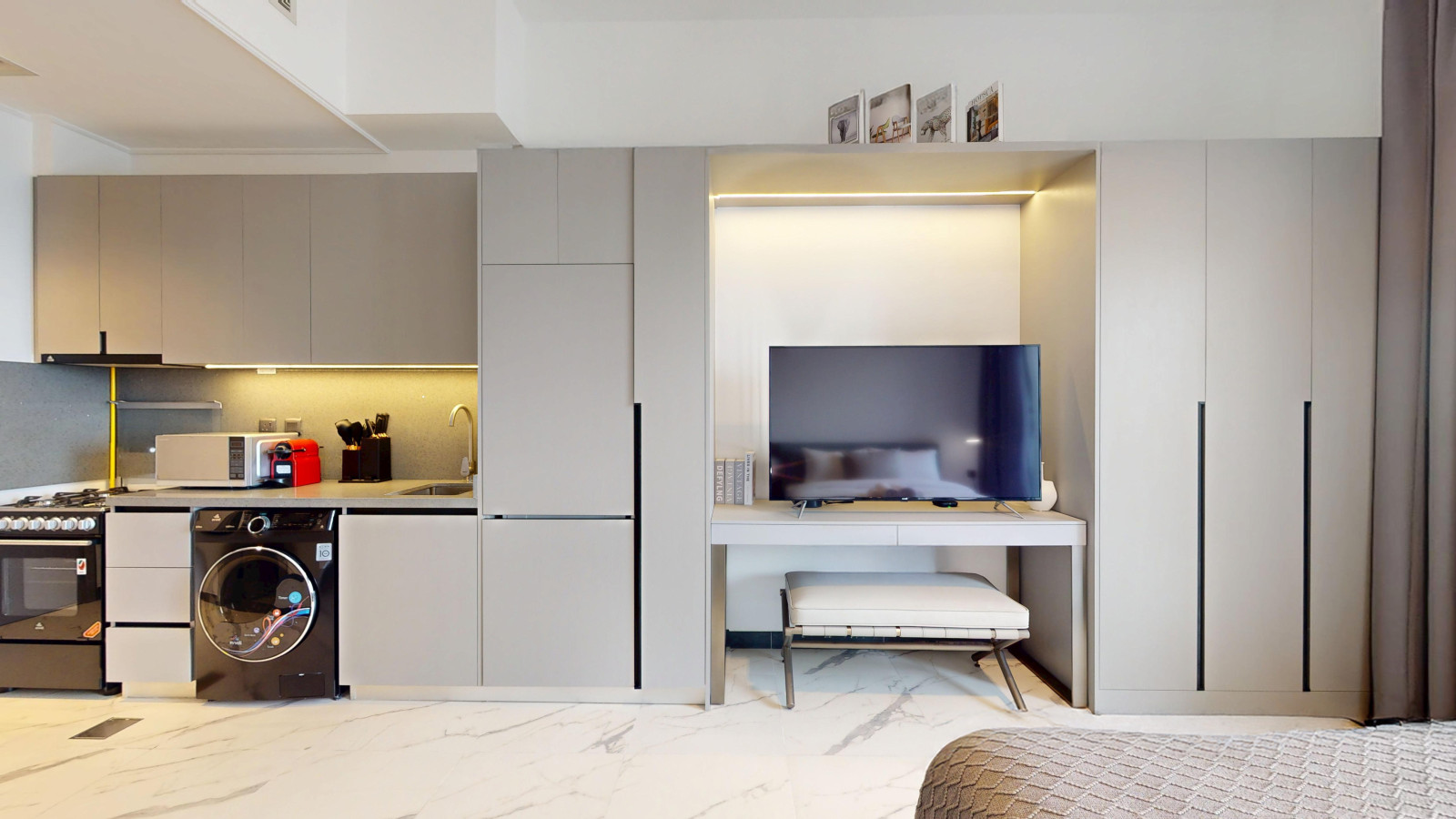This studio is like a dream for solo travelers or a couple. The open-plan layout definitely maximizes the space, creating a seamless flow between the living, dining, and sleeping areas—perfect for those who like an airy, uncluttered environment. The modern design adds to the sense of luxury and comfort, making it easy to relax and unwind after a day of exploring Dubai.