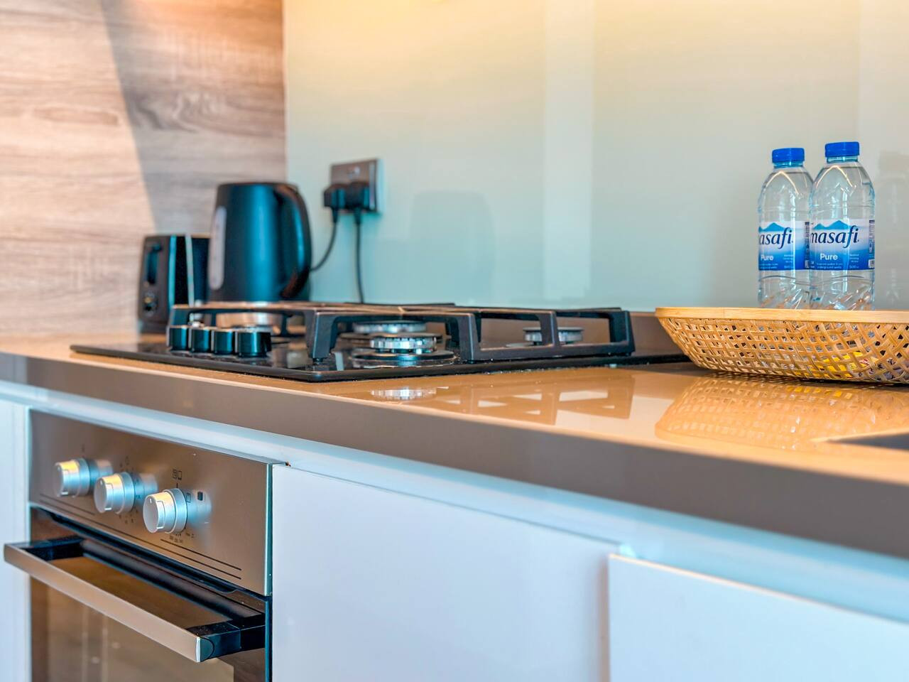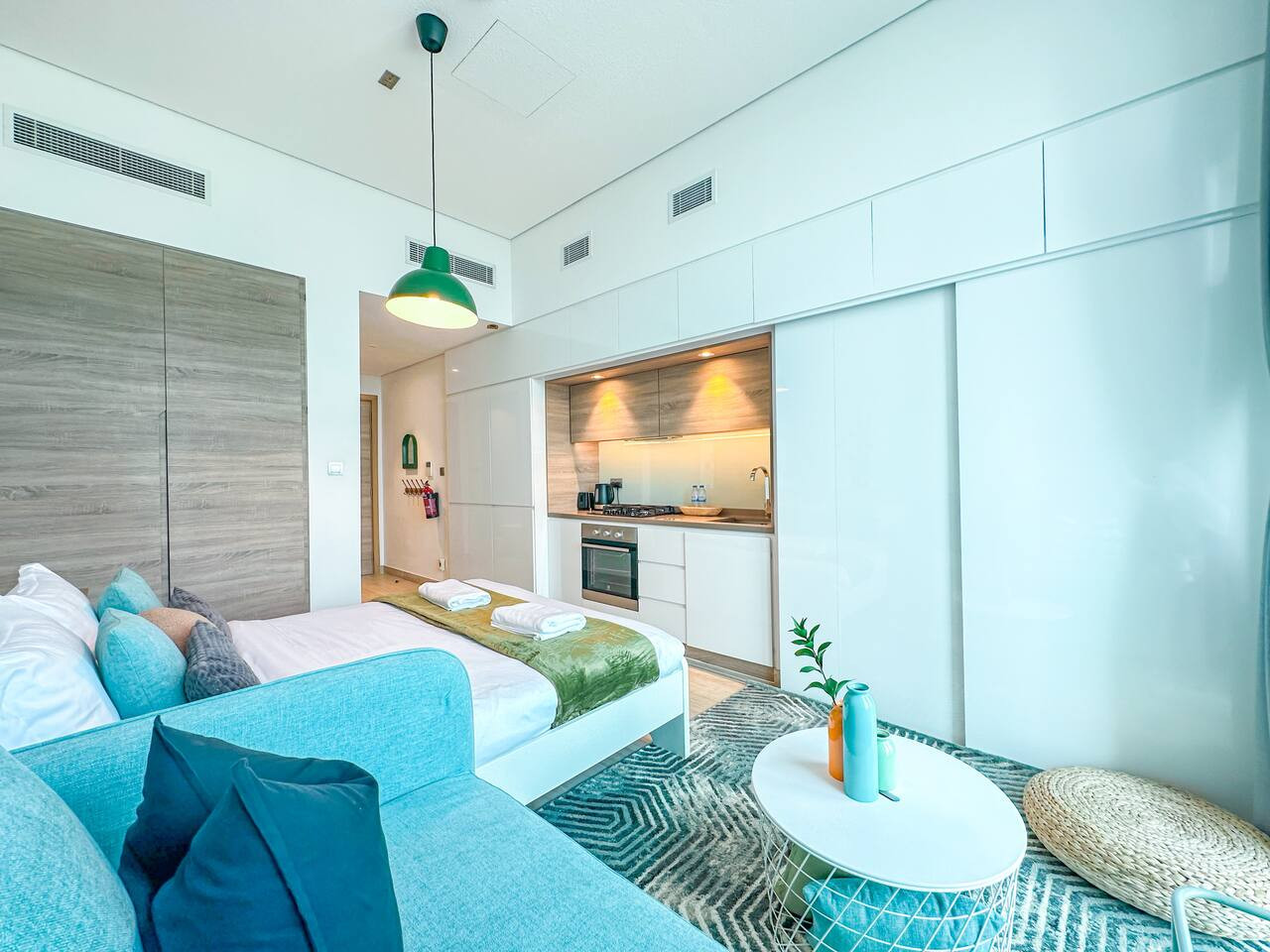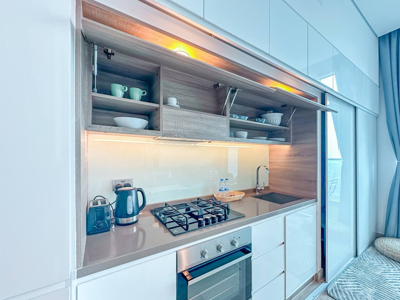 The open-plan kitchen is equipped with essentials for a comfortable stay. Whether it’s a fresh coffee in the morning or a quick meal at home, you’ll find everything you need.