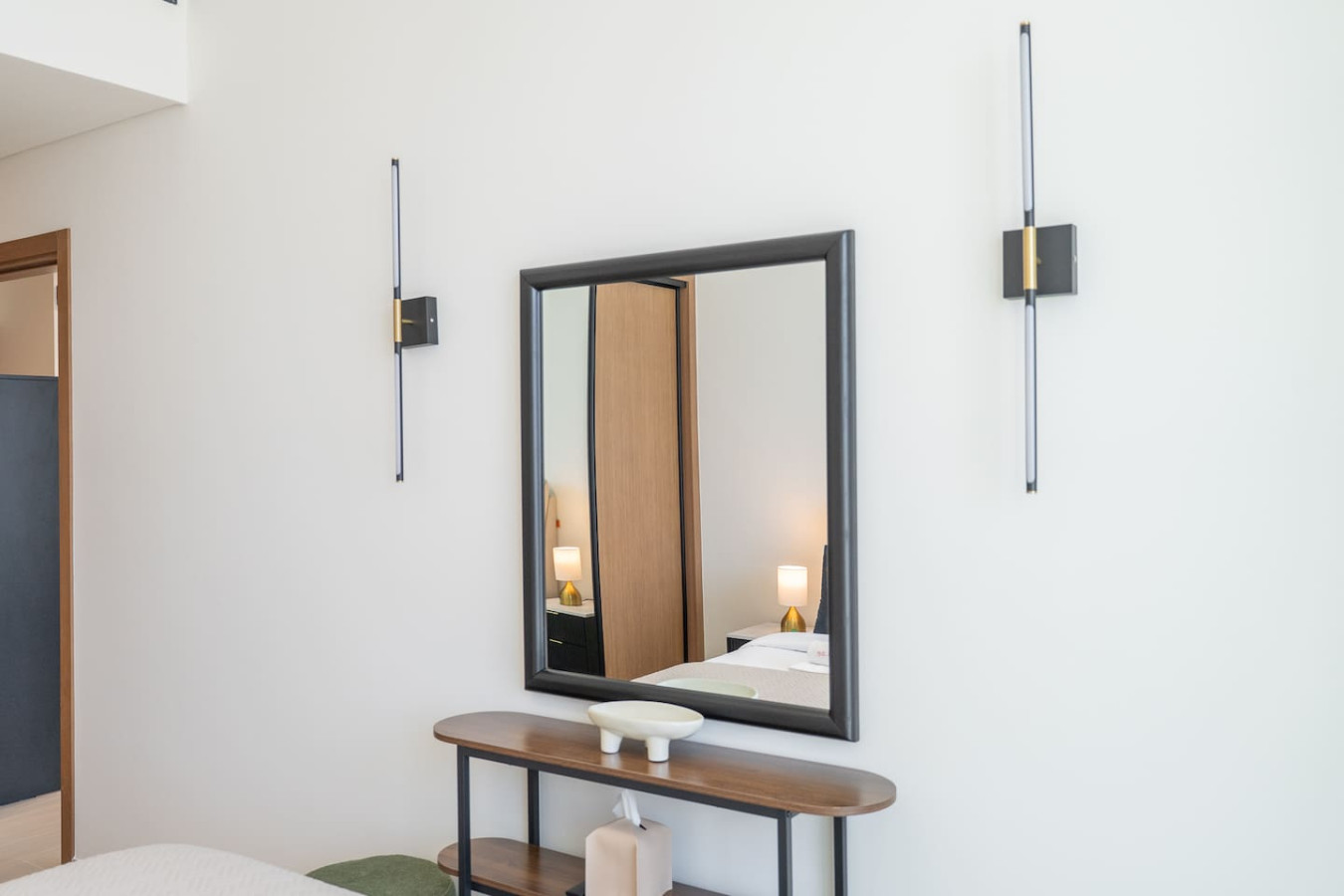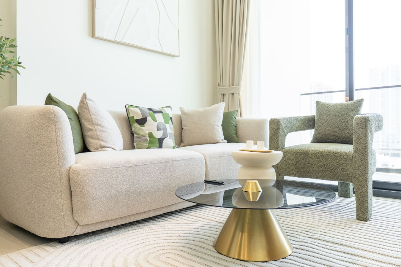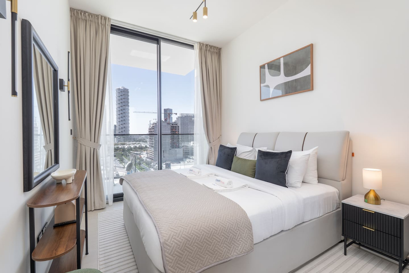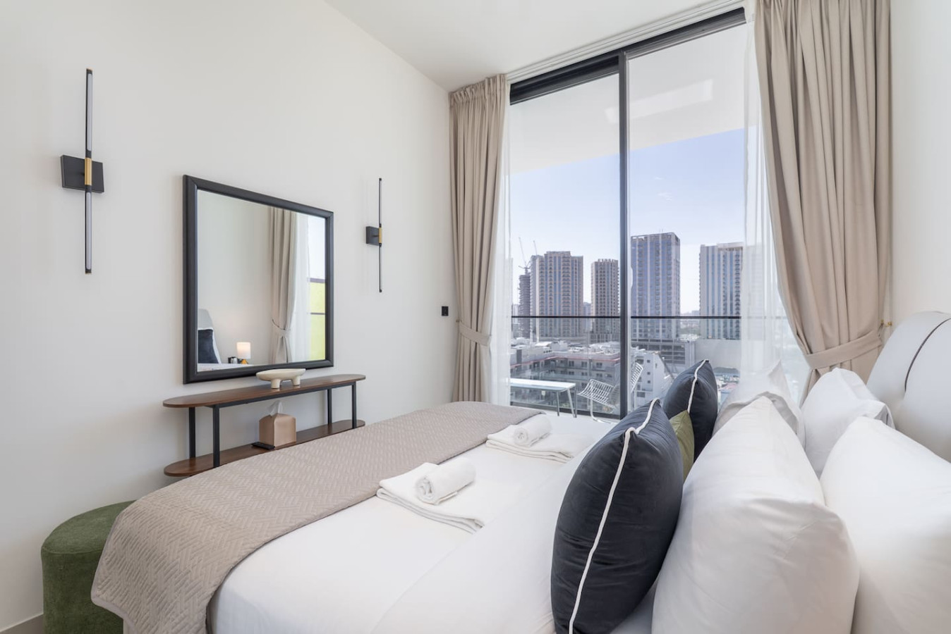 Retreat to the serene bedroom, featuring a cozy queen-size bed, high-quality linens, and generous wardrobe space. Sunlight pours through the large windows, filling the room with a fresh, airy feel.