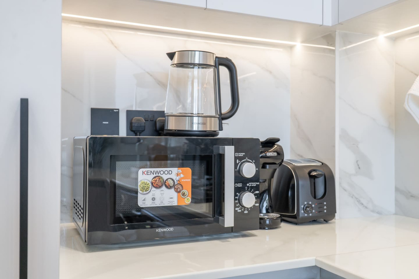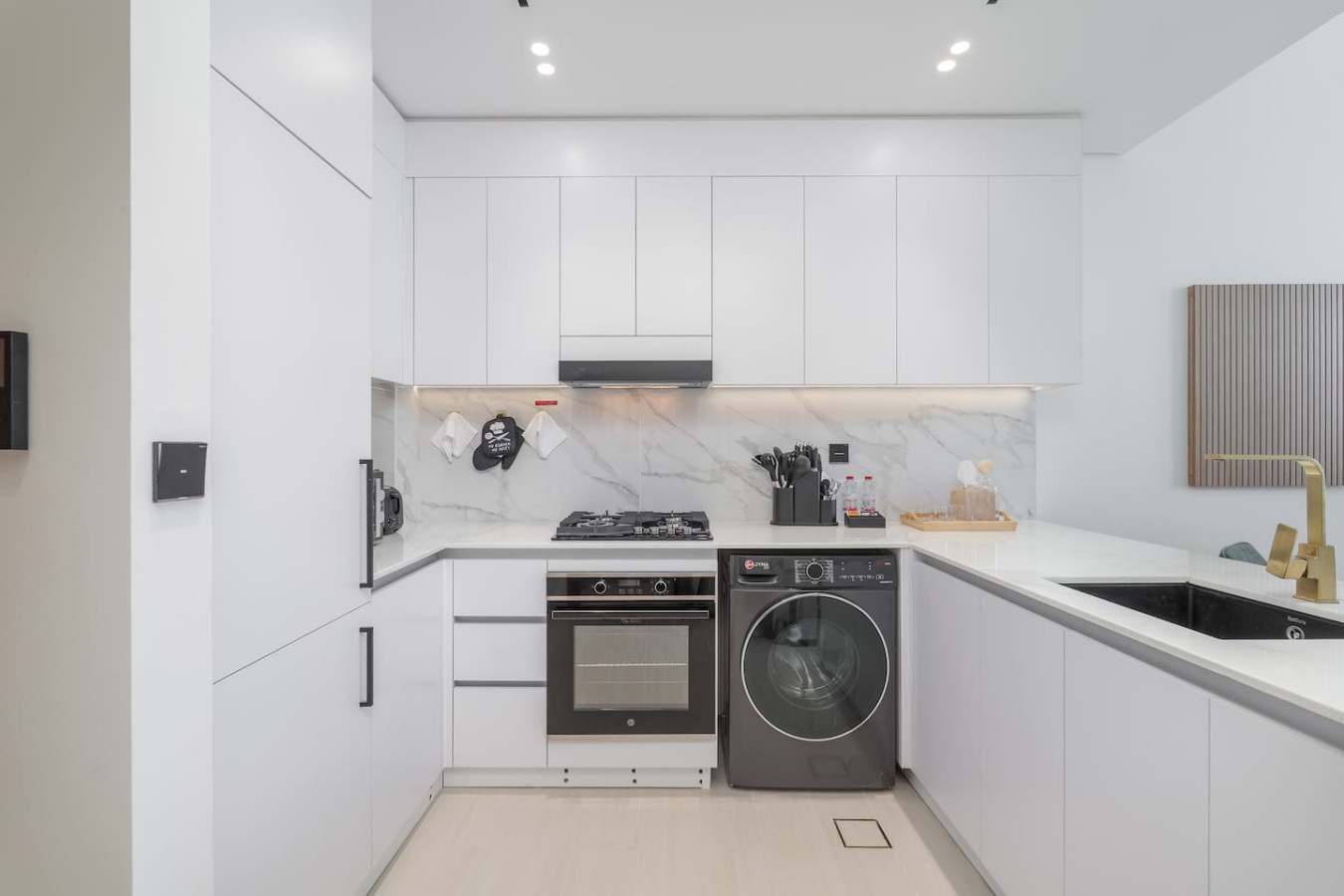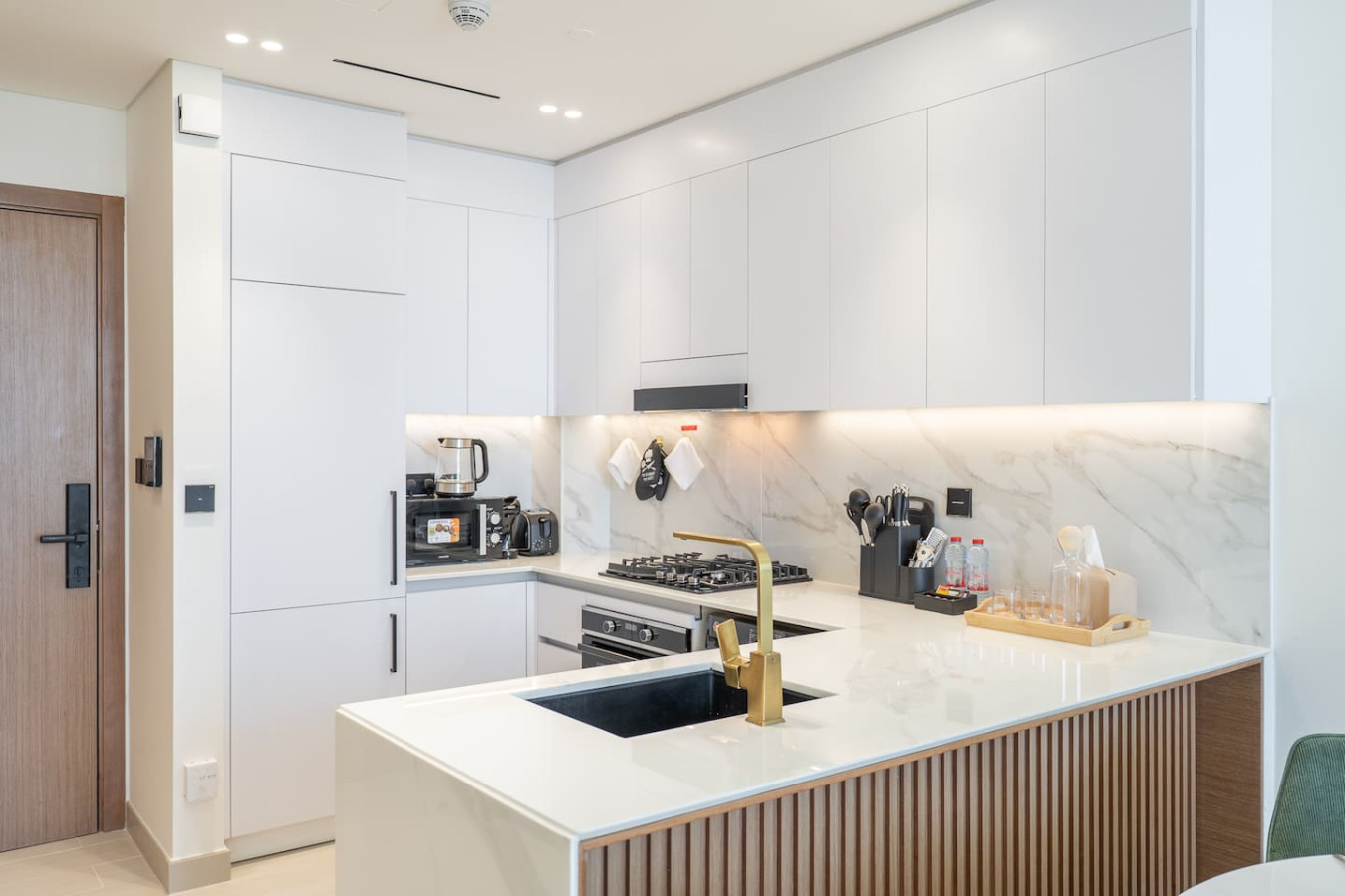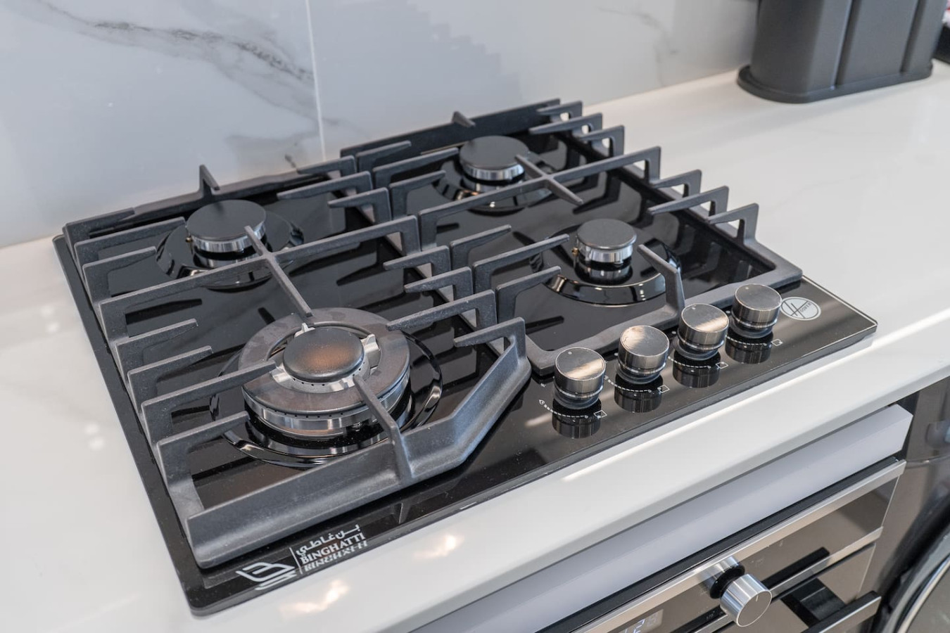 The sleek, fully equipped kitchen comes with a stove, microwave, fridge, and all the essentials you need to cook up your favorite dishes effortlessly.