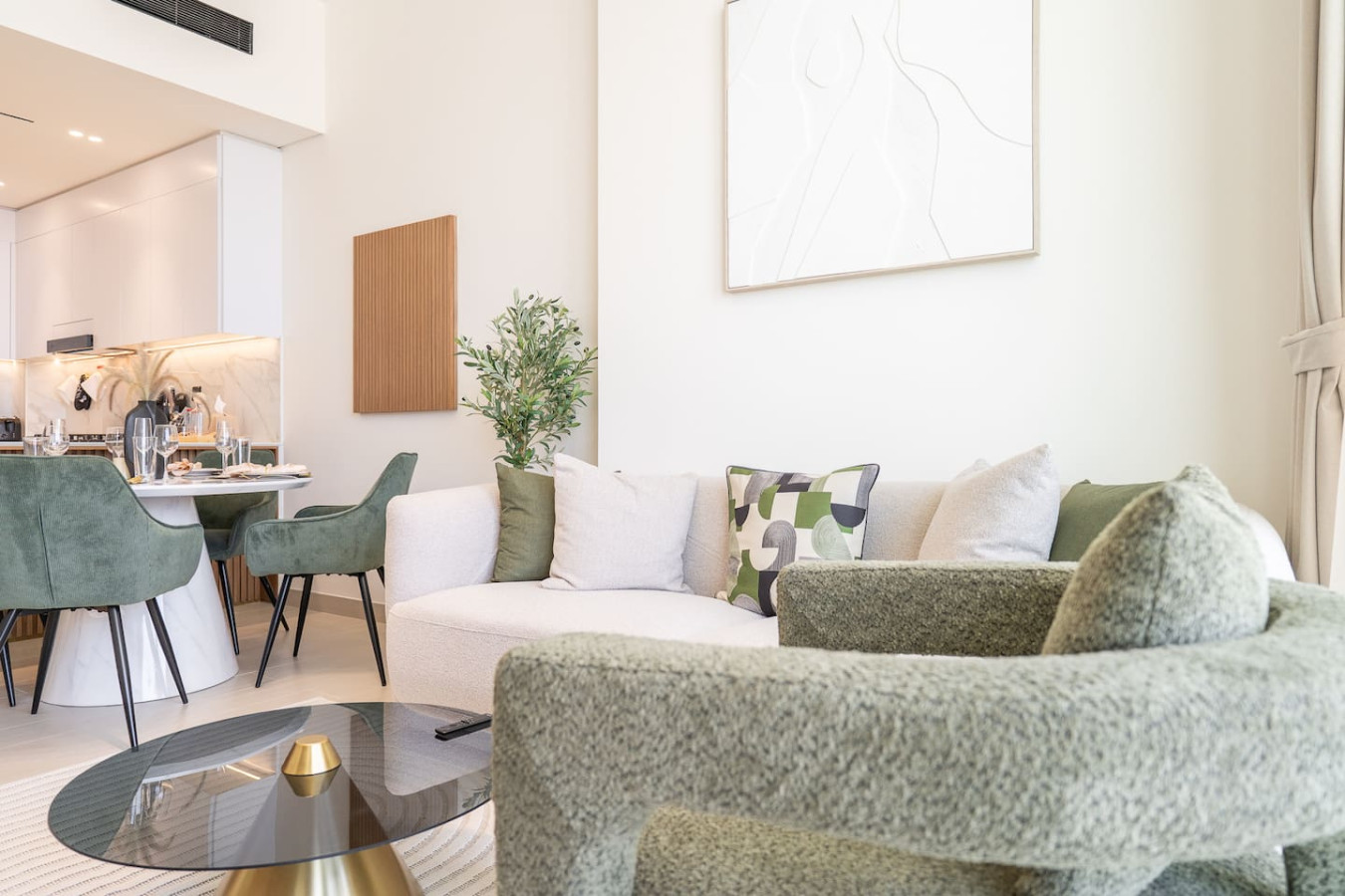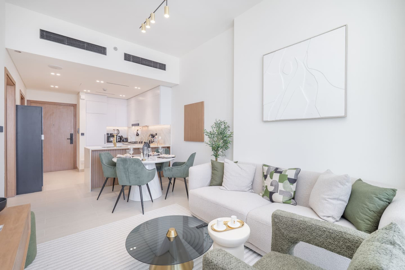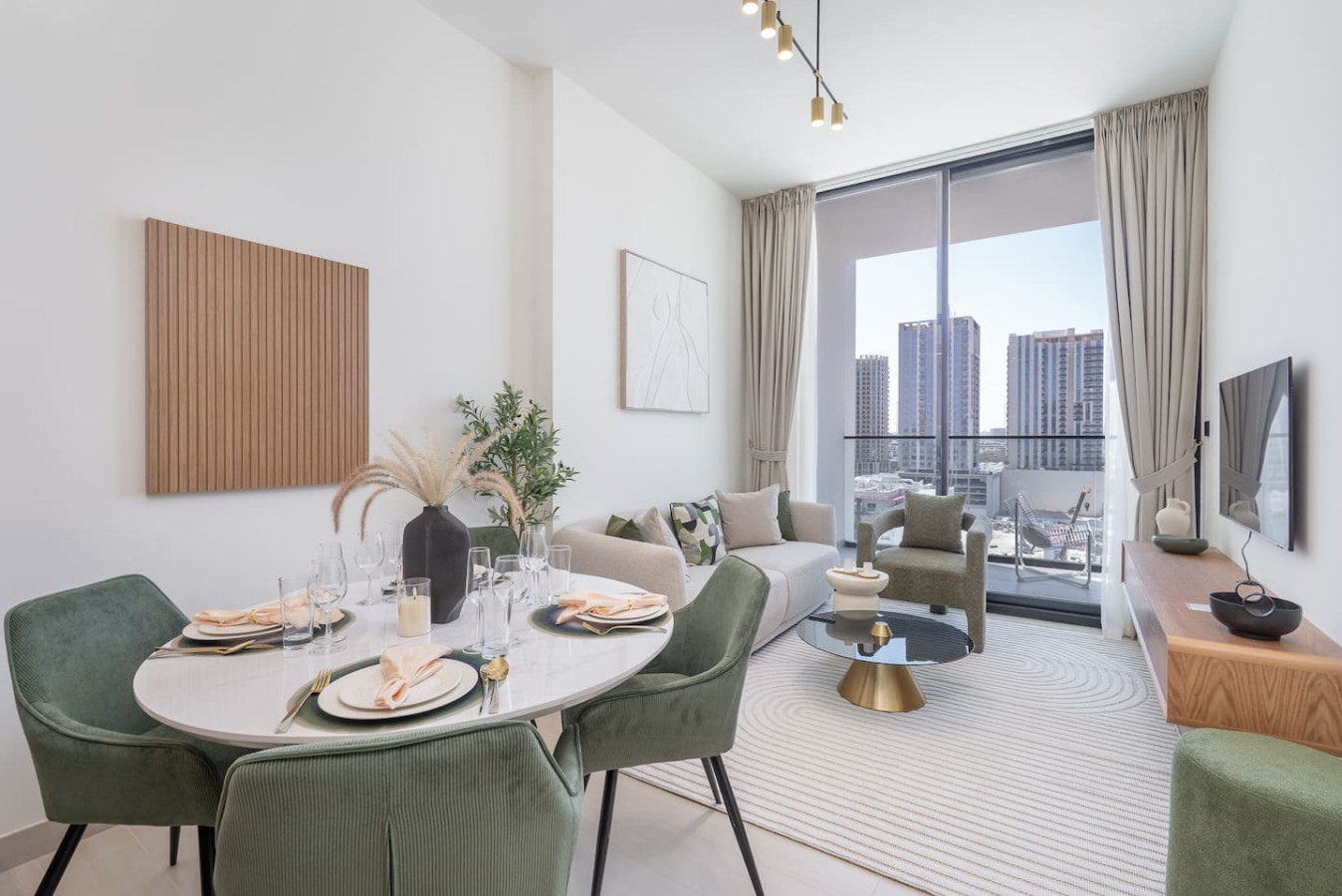 Step into a modern haven where comfort meets style. This thoughtfully designed 1BHK apartment offers a welcoming living space with a plush sofa, smart TV, and a chic dining nook — perfect for relaxing evenings or casual meals.