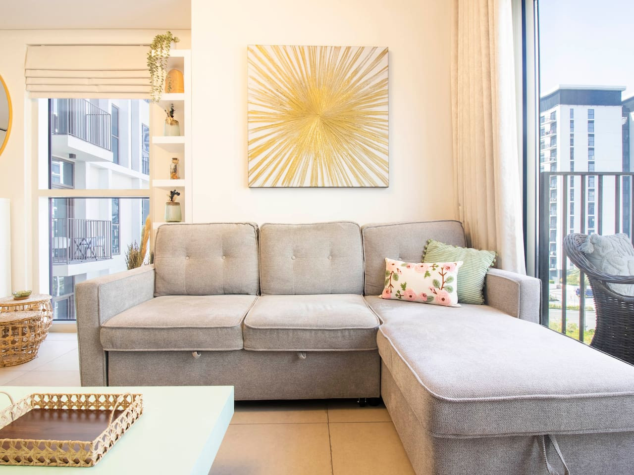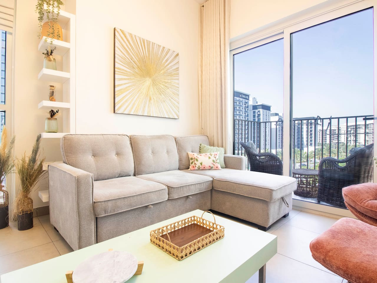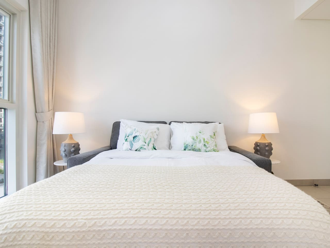 Unwind in a cozy yet modern living area designed for relaxation and entertainment. Sink into the plush sofa while watching your favorite shows on the Smart TV, or step out onto the balcony to take in the vibrant Dubai Hills Boulevard view. The sofa easily converts into a bed, perfect for accommodating extra guests.