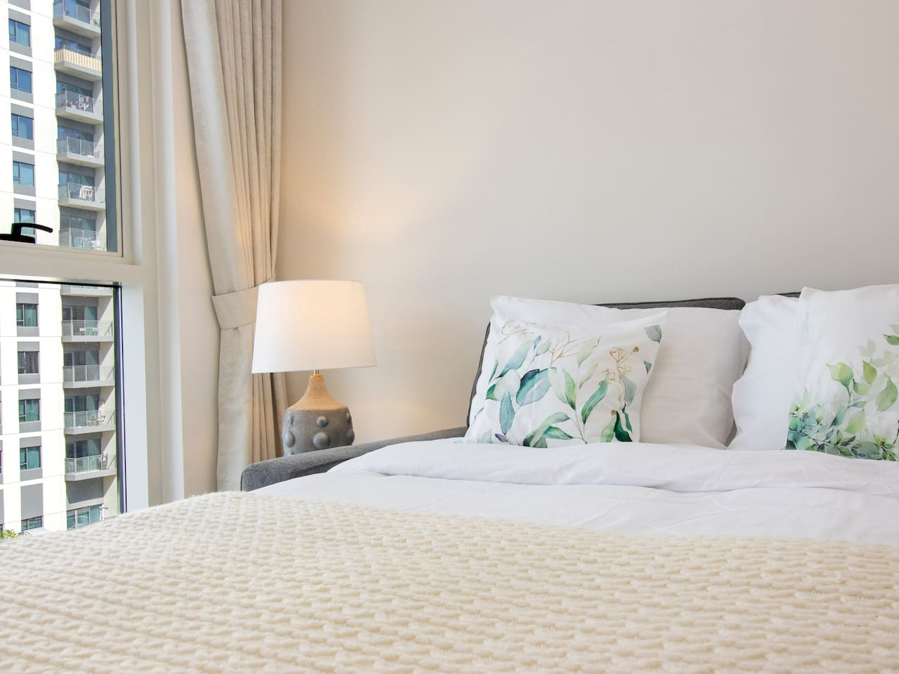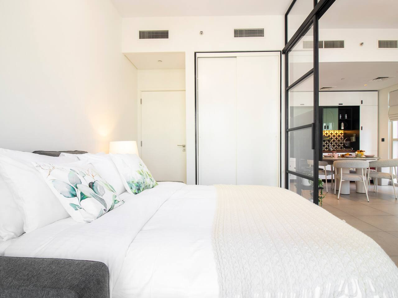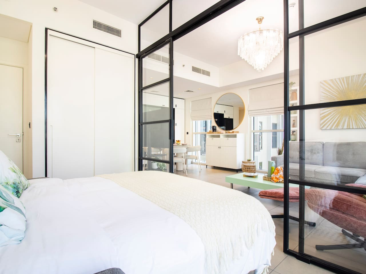 Unwind in a cozy yet modern living area designed for relaxation and entertainment. Sink into the plush sofa while watching your favorite shows on the Smart TV, or step out onto the balcony to take in the vibrant Dubai Hills Boulevard view. The sofa easily converts into a bed, perfect for accommodating extra guests.