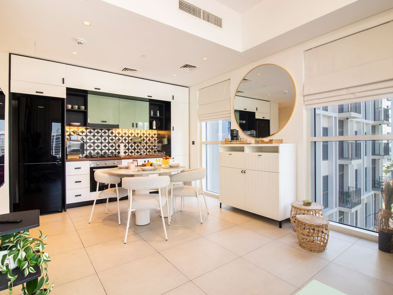 The sleek open-plan kitchen offers everything you need to prepare and enjoy meals at home — from quick snacks to full dinners. The dining area provides a bright and comfortable space to gather and dine.