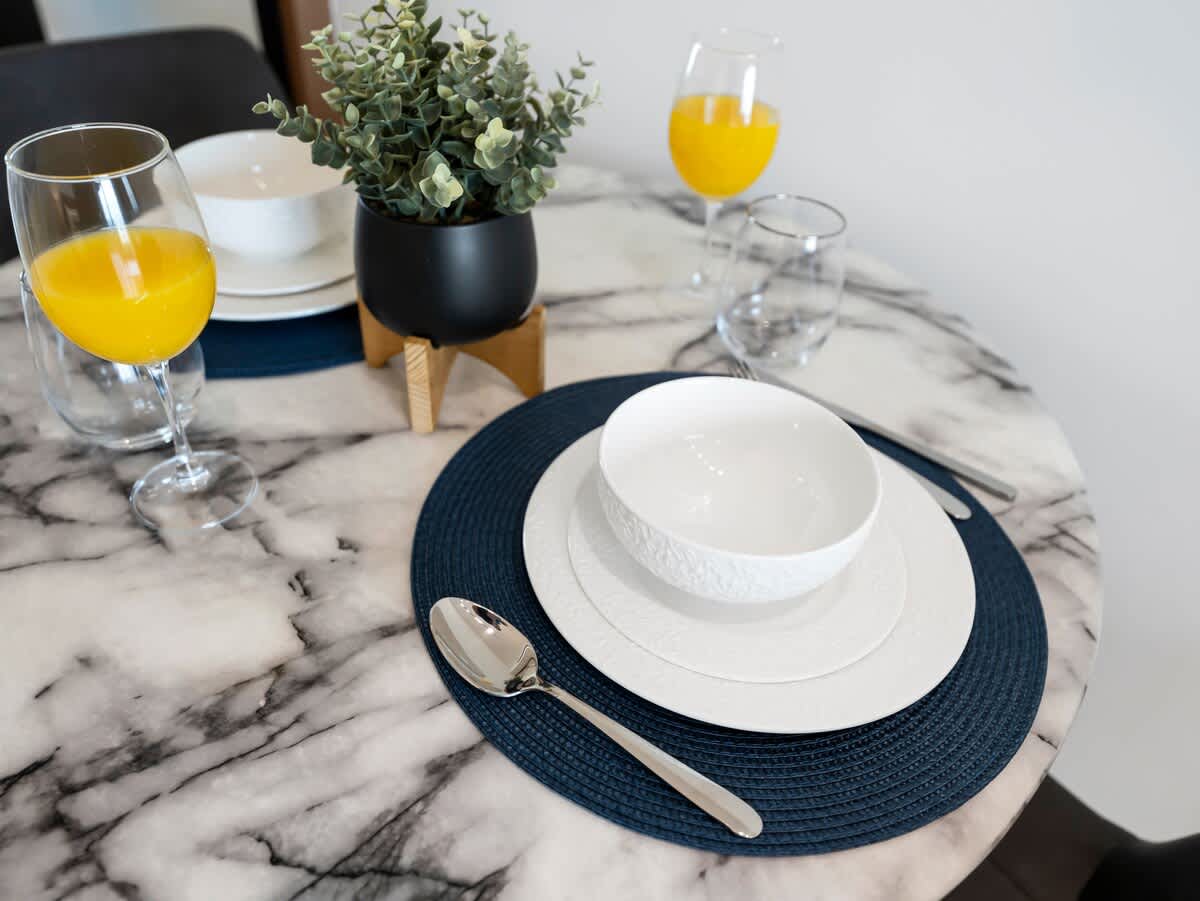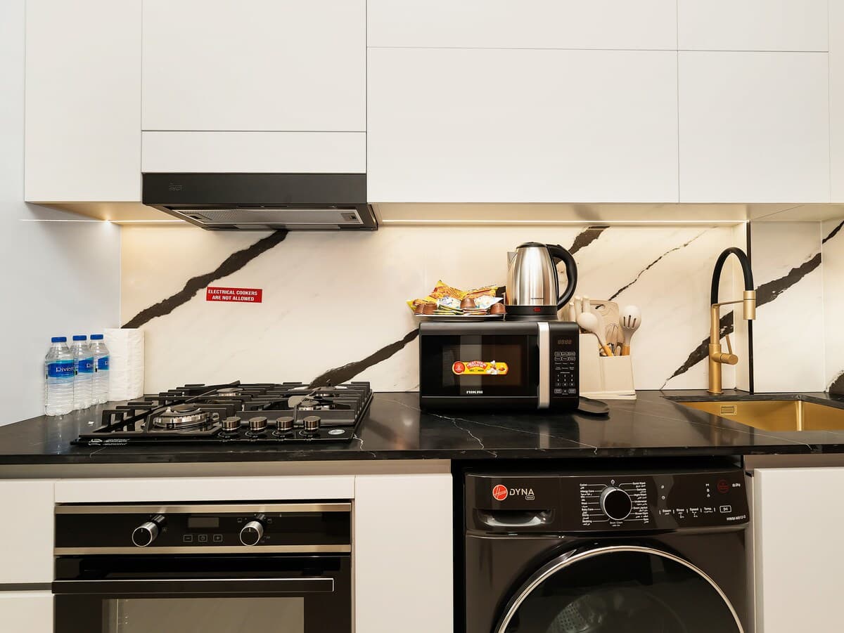 Kitchen: A modern, fully equipped kitchen with sleek appliances, cookware, and dining essentials allows you to prepare meals, whether it’s a quick breakfast or a romantic dinner for two.