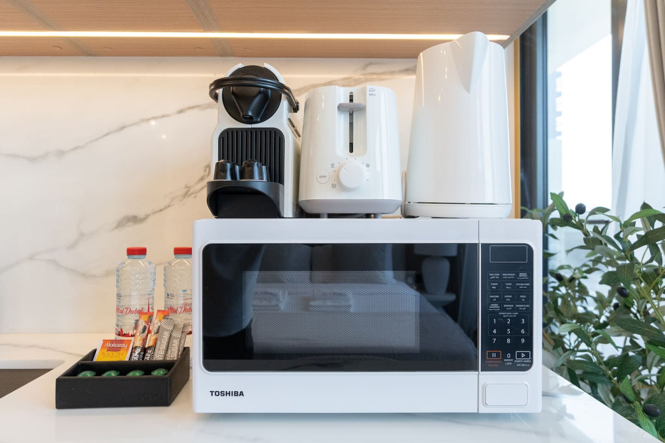 Refrigerator, Electric stove & oven, Microwave, Kettle & toaster, Full set of cookware, utensils, and dinnerware, Perfect for preparing anything from a quick breakfast to a simple dinner at home.