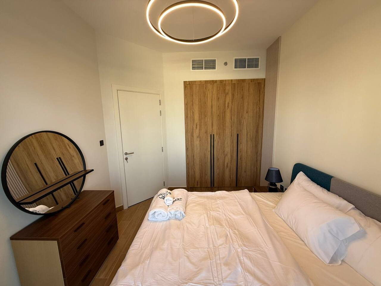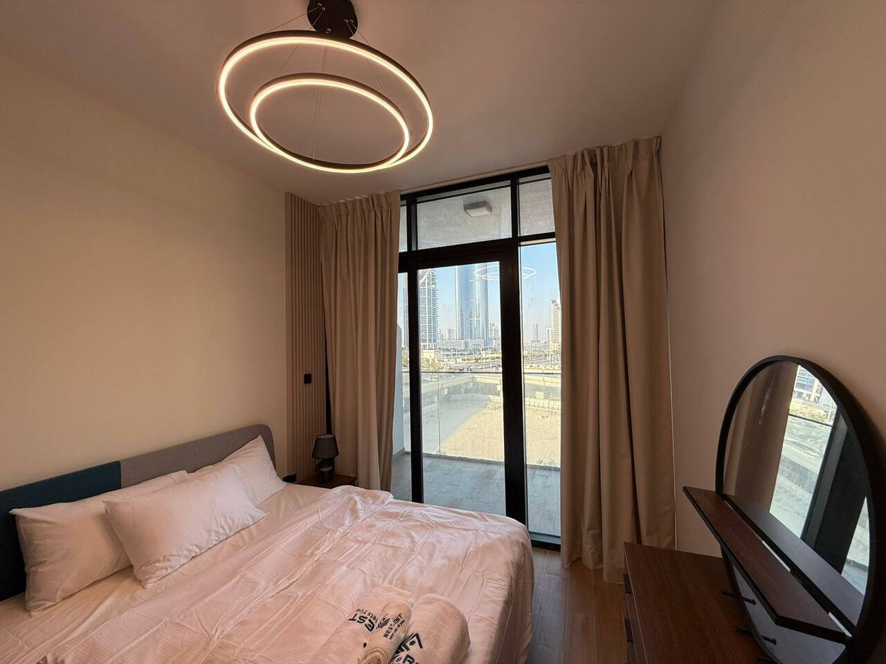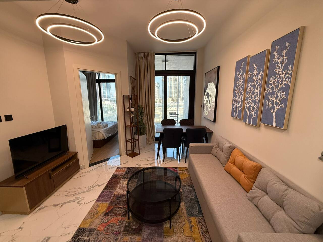 This modern apartment offers comfort and convenience with elegant interiors, a fully equipped kitchen, and access to a pool and gym.