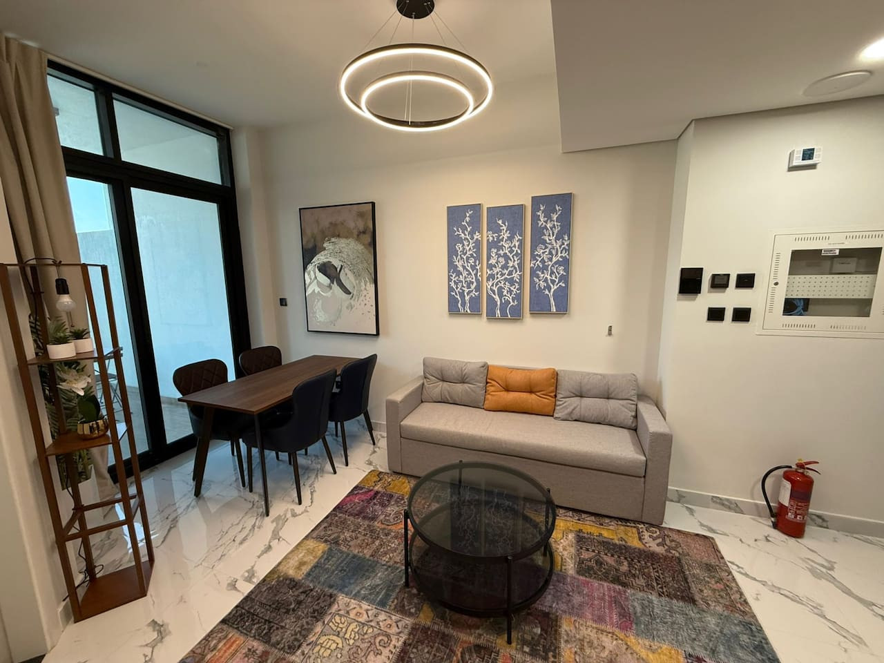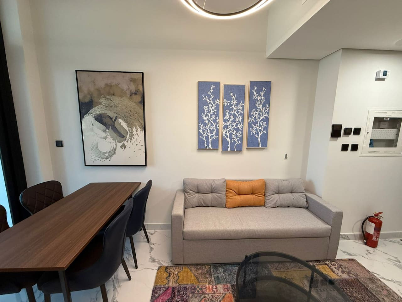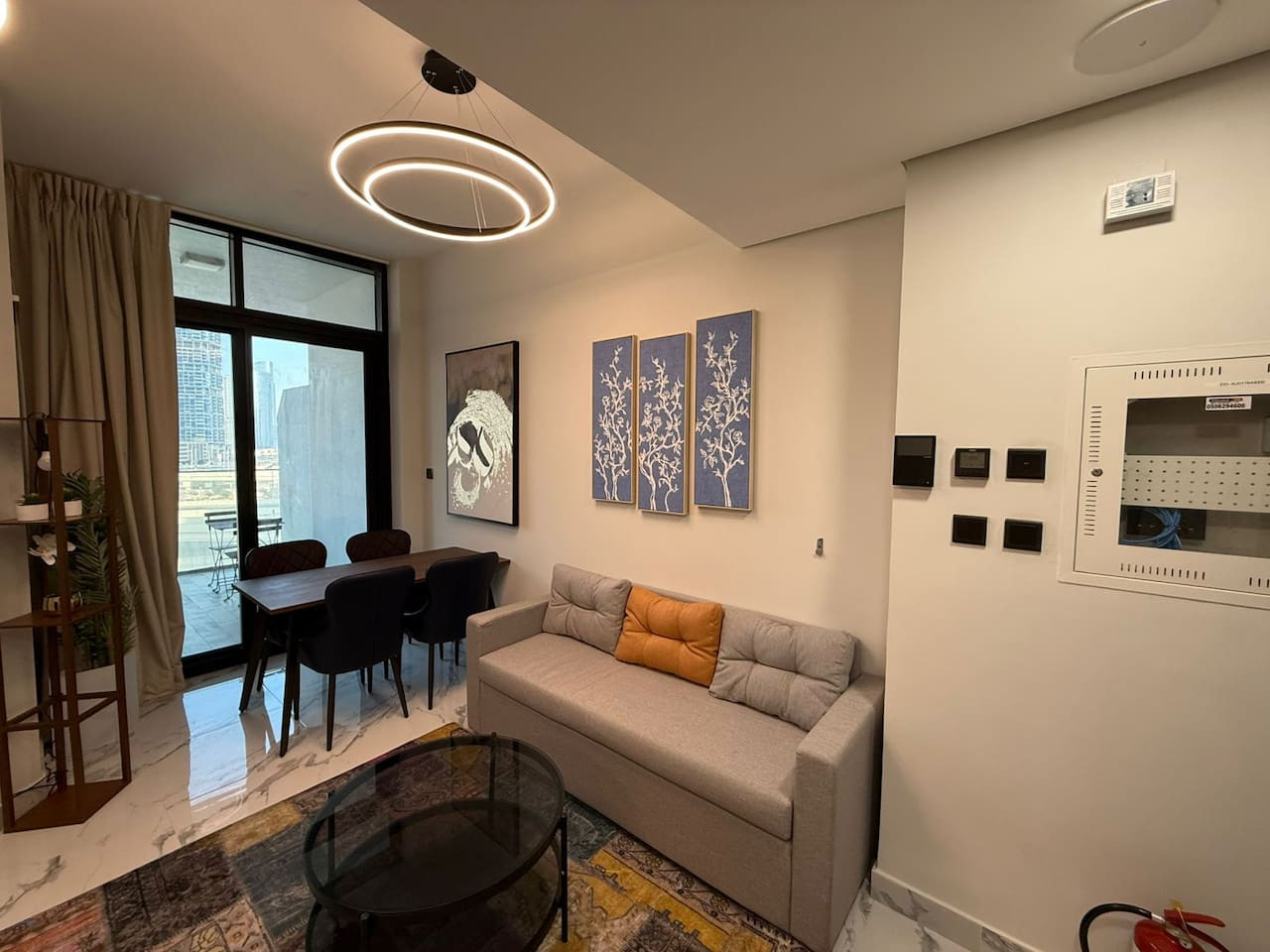 This modern apartment offers comfort and convenience with elegant interiors, a fully equipped kitchen, and access to a pool and gym.