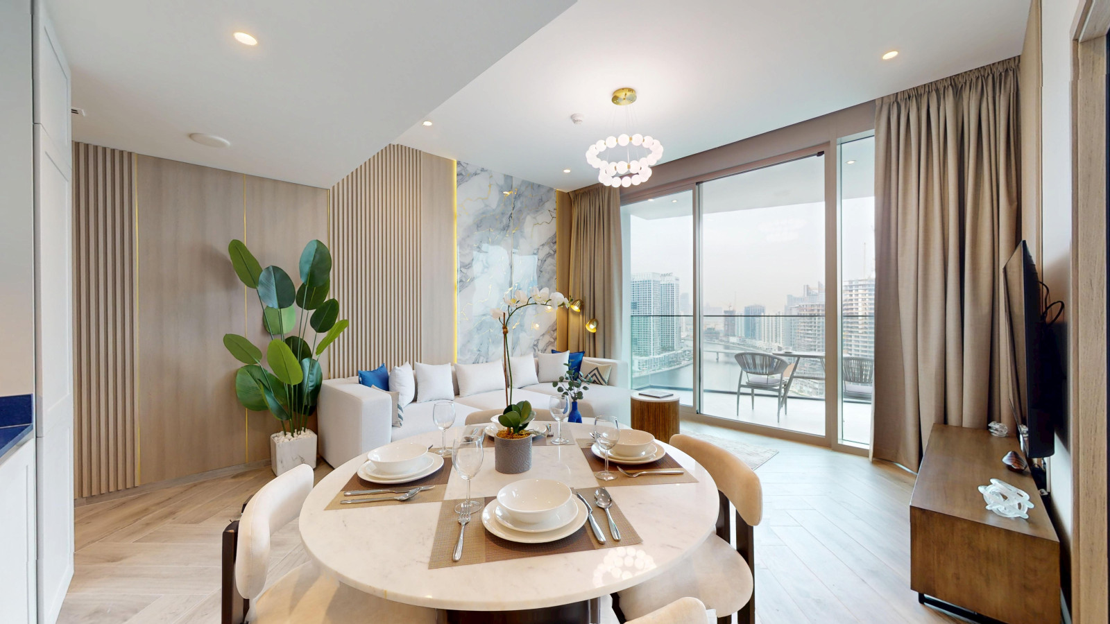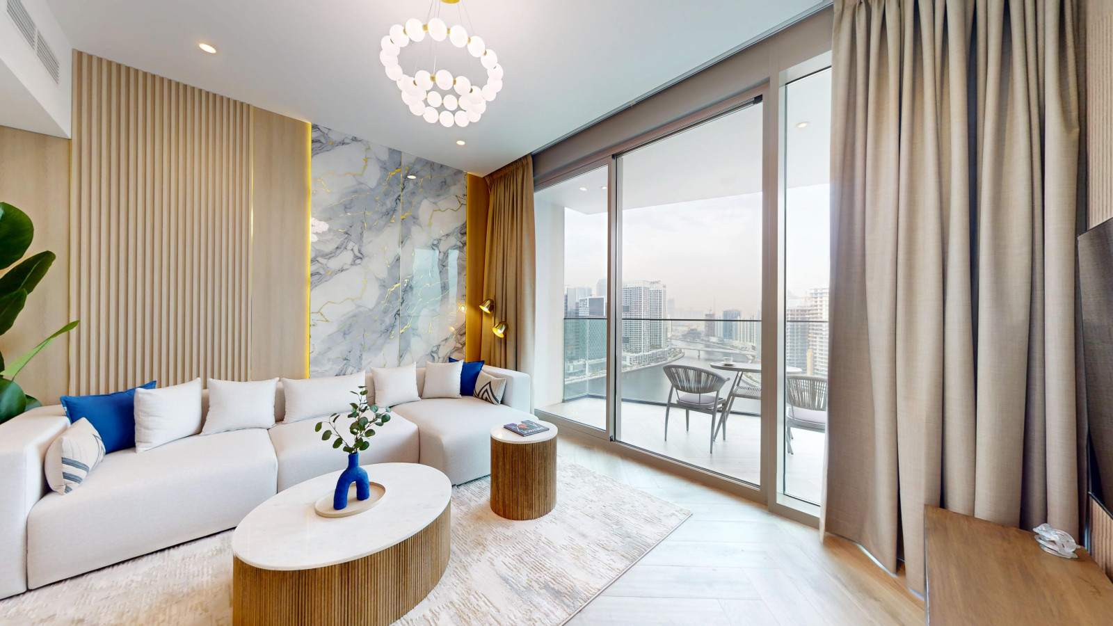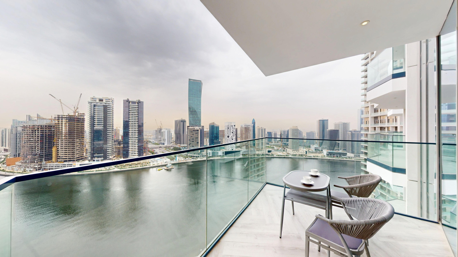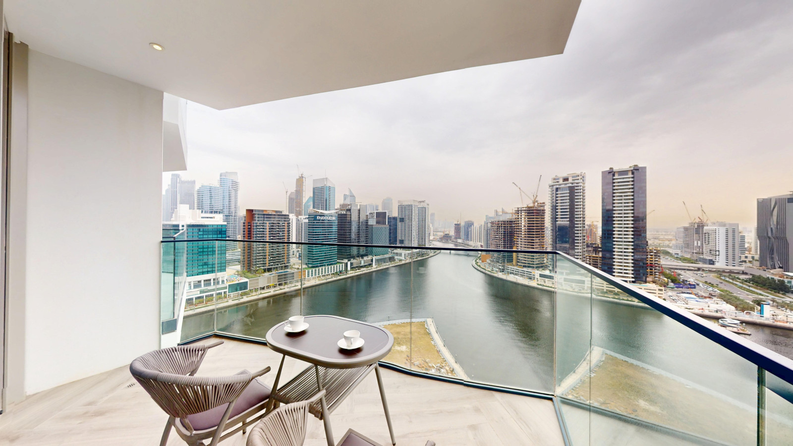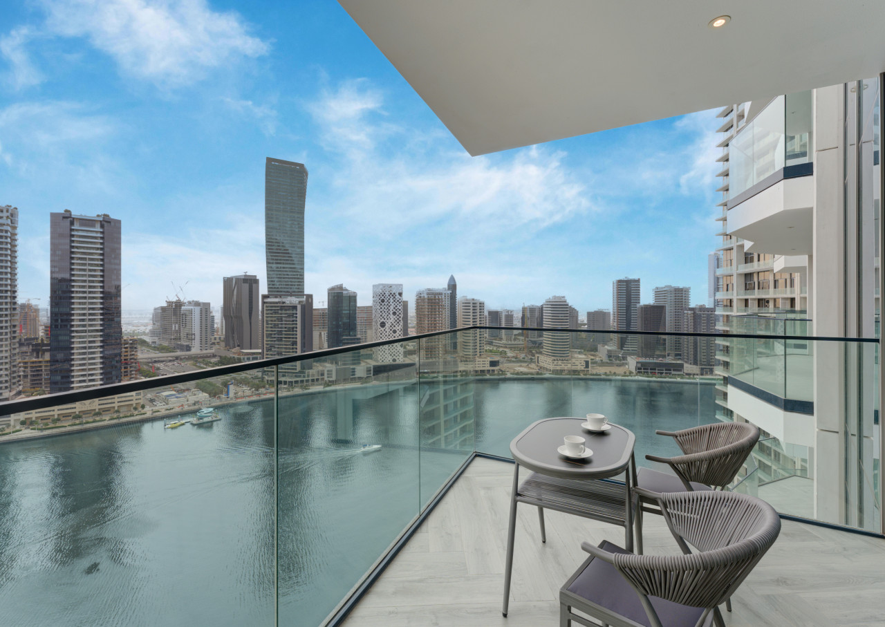 – Fully furnished balcony with city skyline and canal views