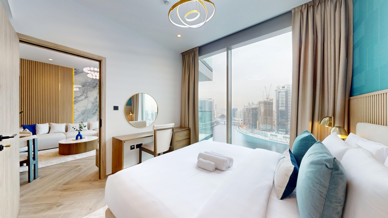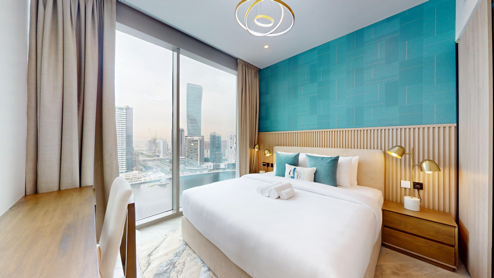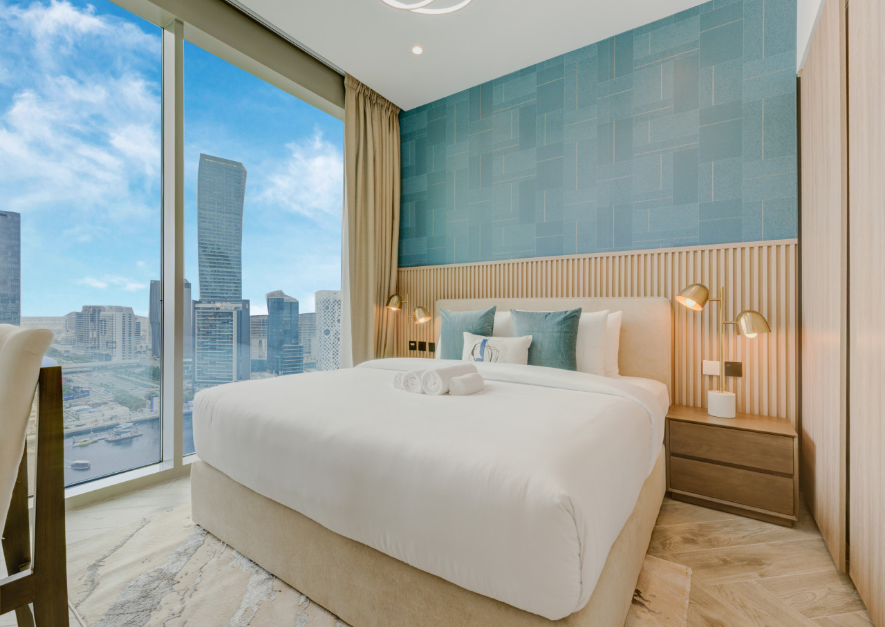 Stay in this modern one-bedroom apartment designed for comfort and convenience. The space features tasteful furnishings and contemporary finishes, creating a stylish and welcoming atmosphere. Relax in a thoughtfully arranged living area with direct access to a balcony offering city skyline and canal views, unwind in a cozy bedroom with premium bedding, and enjoy a fully equipped kitchen with modern appliances for easy meal preparation.