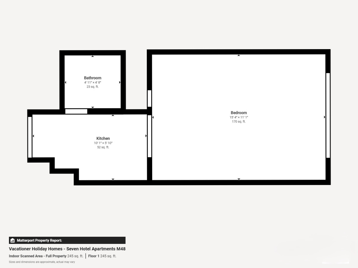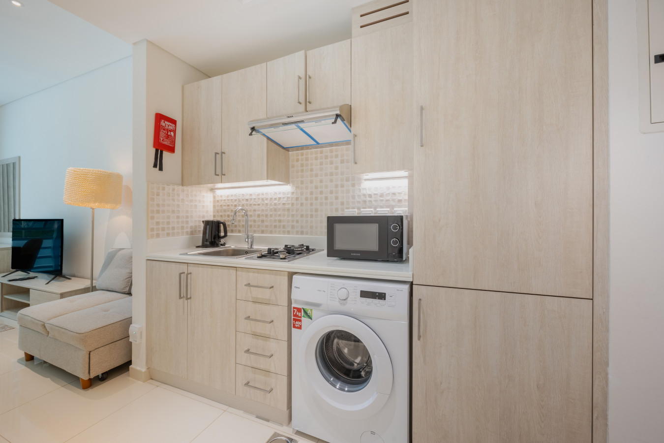 Guests will certainly live in style in this comfortable studio apartment featuring simple yet elegant furniture designed to enhance their stay. The compact kitchen complements the open living, dining and sleeping space, providing a cozy space for relaxation.