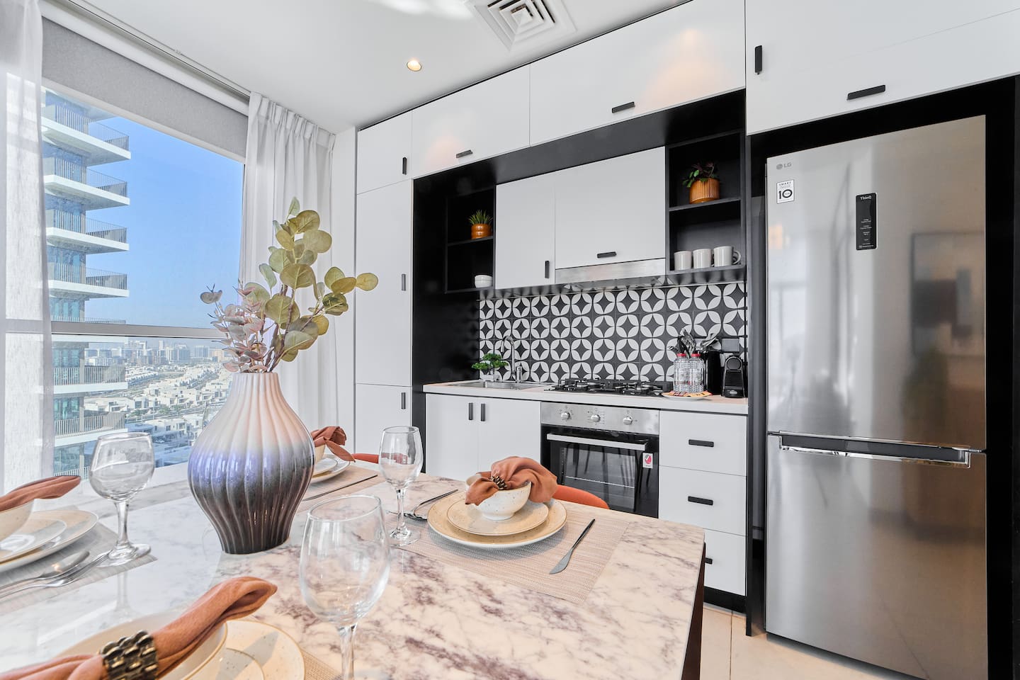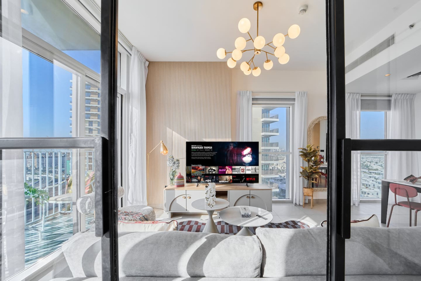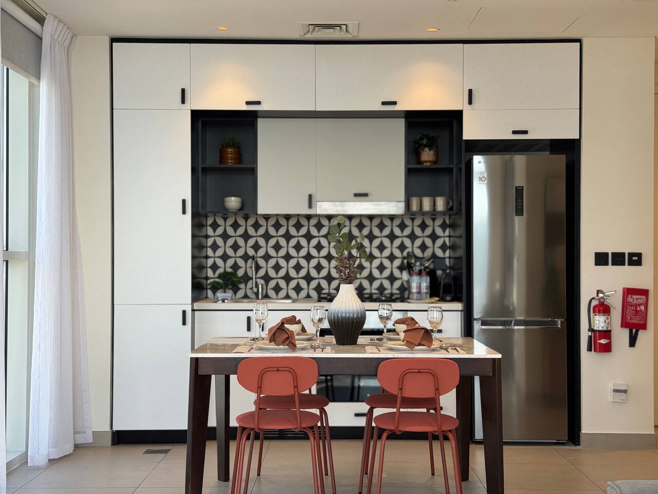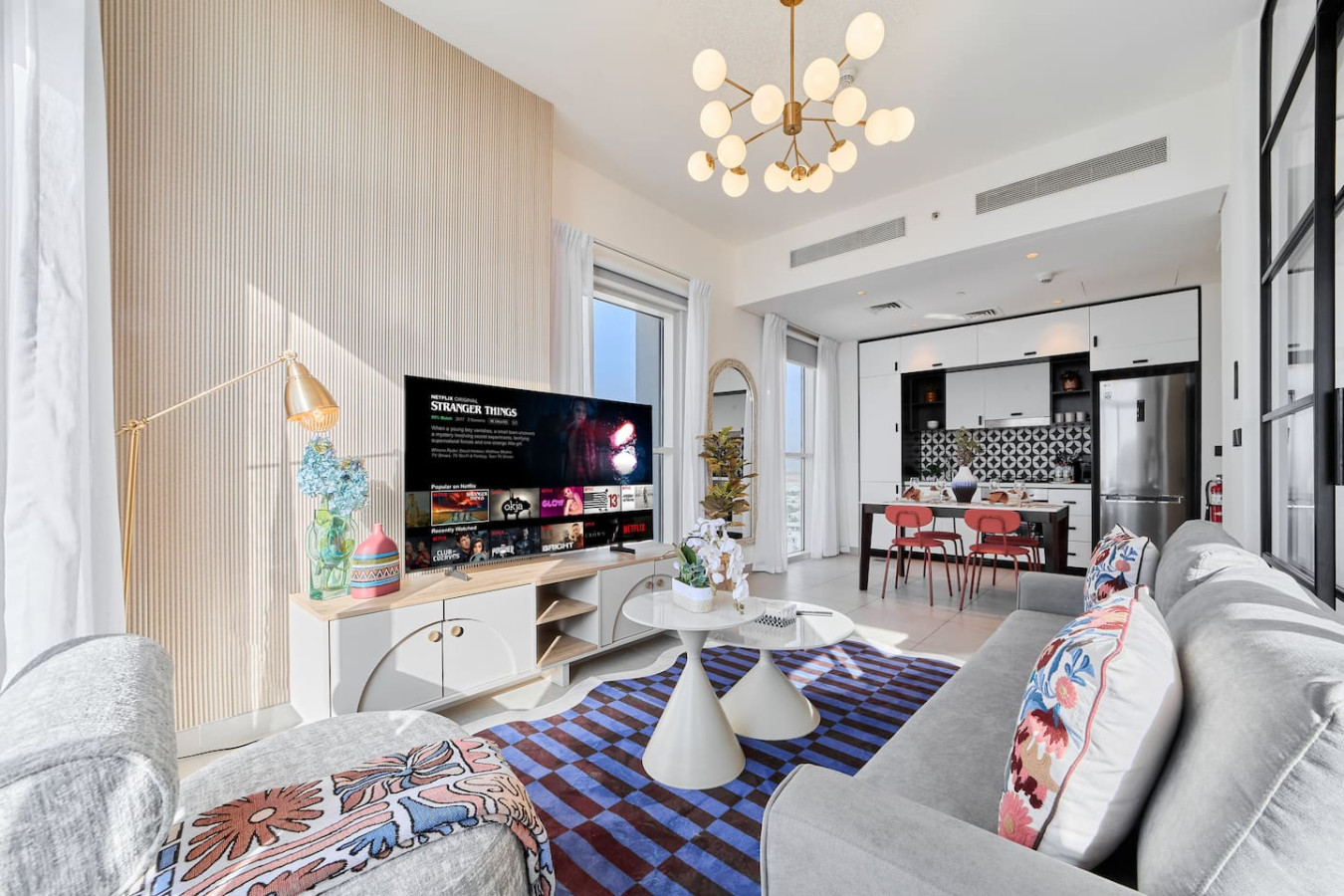 Step into a bright and stylish living space designed for comfort and flexibility. Relax on the plush sofa (which converts into a sofa bed for extra guests), enjoy your favorite shows on the Smart TV, or unwind on the balcony overlooking Dubai Hills Mall, perfect for your morning coffee or evening wind-down.