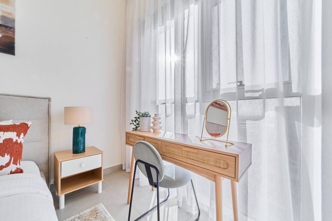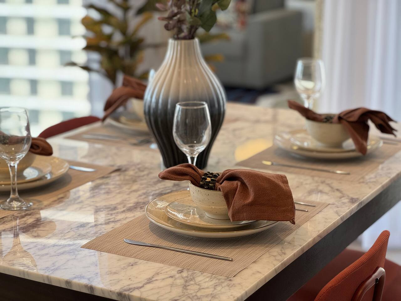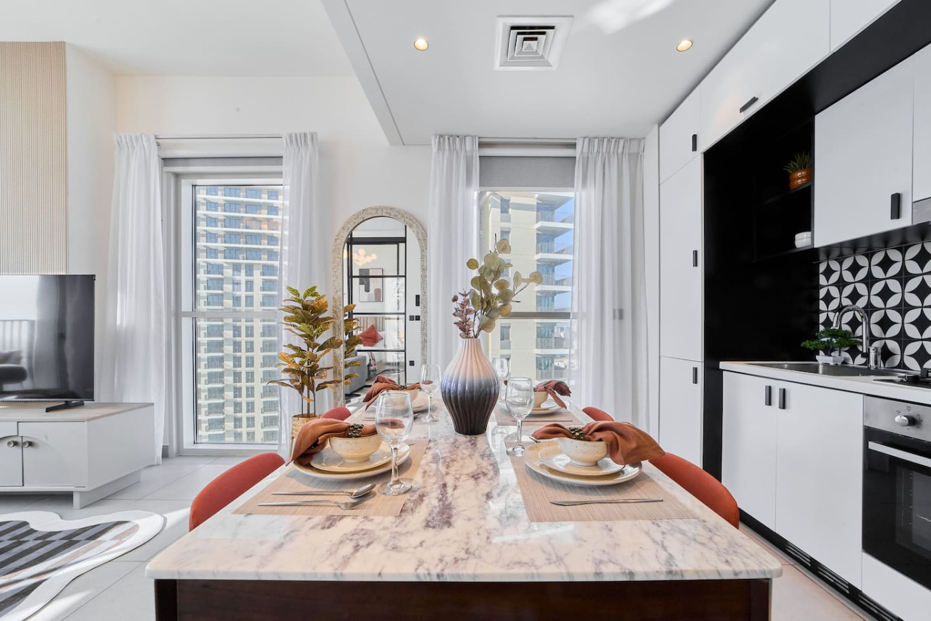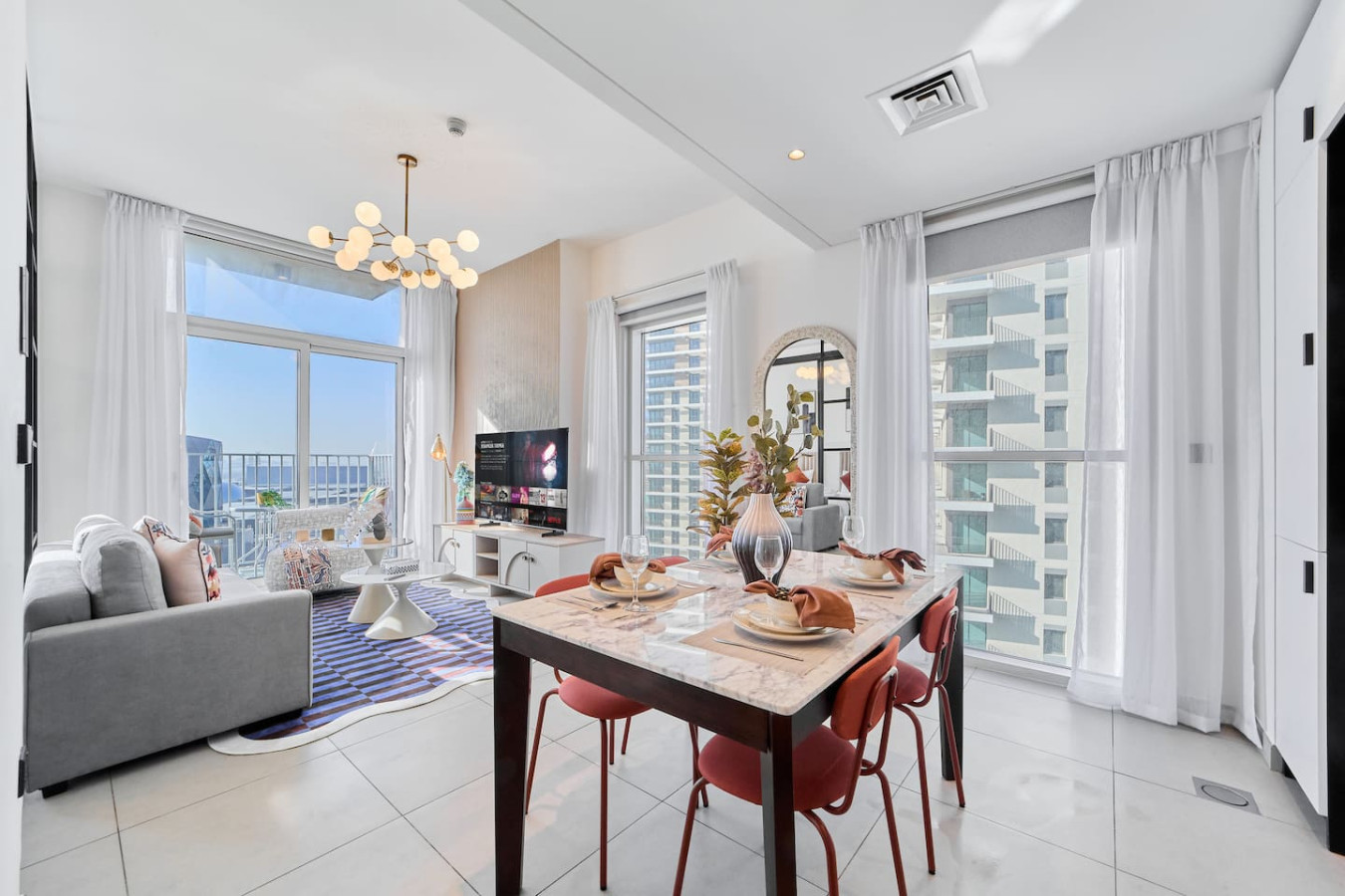 Step into a bright and stylish living space designed for comfort and flexibility. Relax on the plush sofa (which converts into a sofa bed for extra guests), enjoy your favorite shows on the Smart TV, or unwind on the balcony overlooking Dubai Hills Mall, perfect for your morning coffee or evening wind-down.