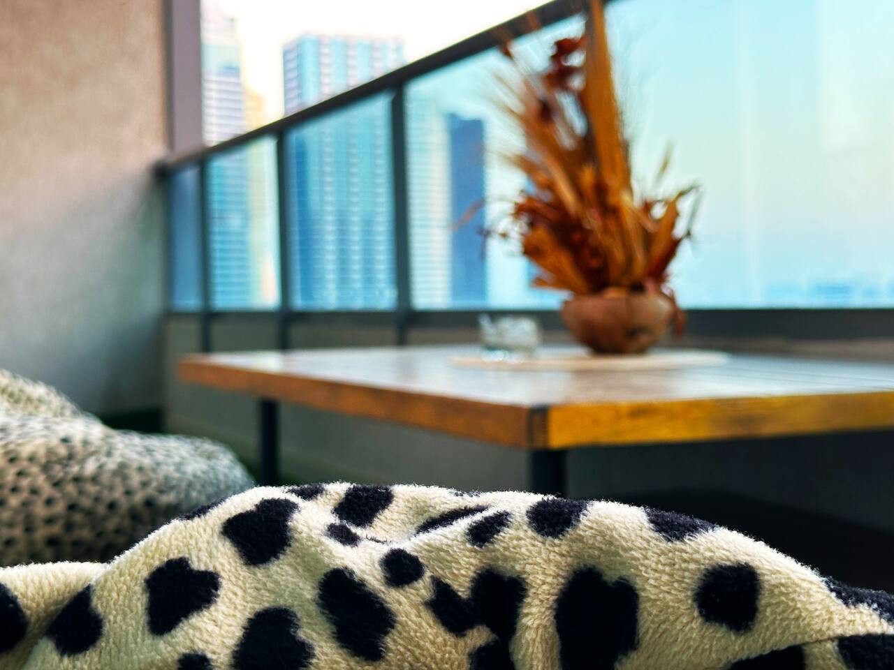 Salga al espacioso balcón amueblado con una mecedora, una mesa de café y sillones puff. Es el lugar perfecto para relajarse y disfrutar del ambiente vibrante de la ciudad.